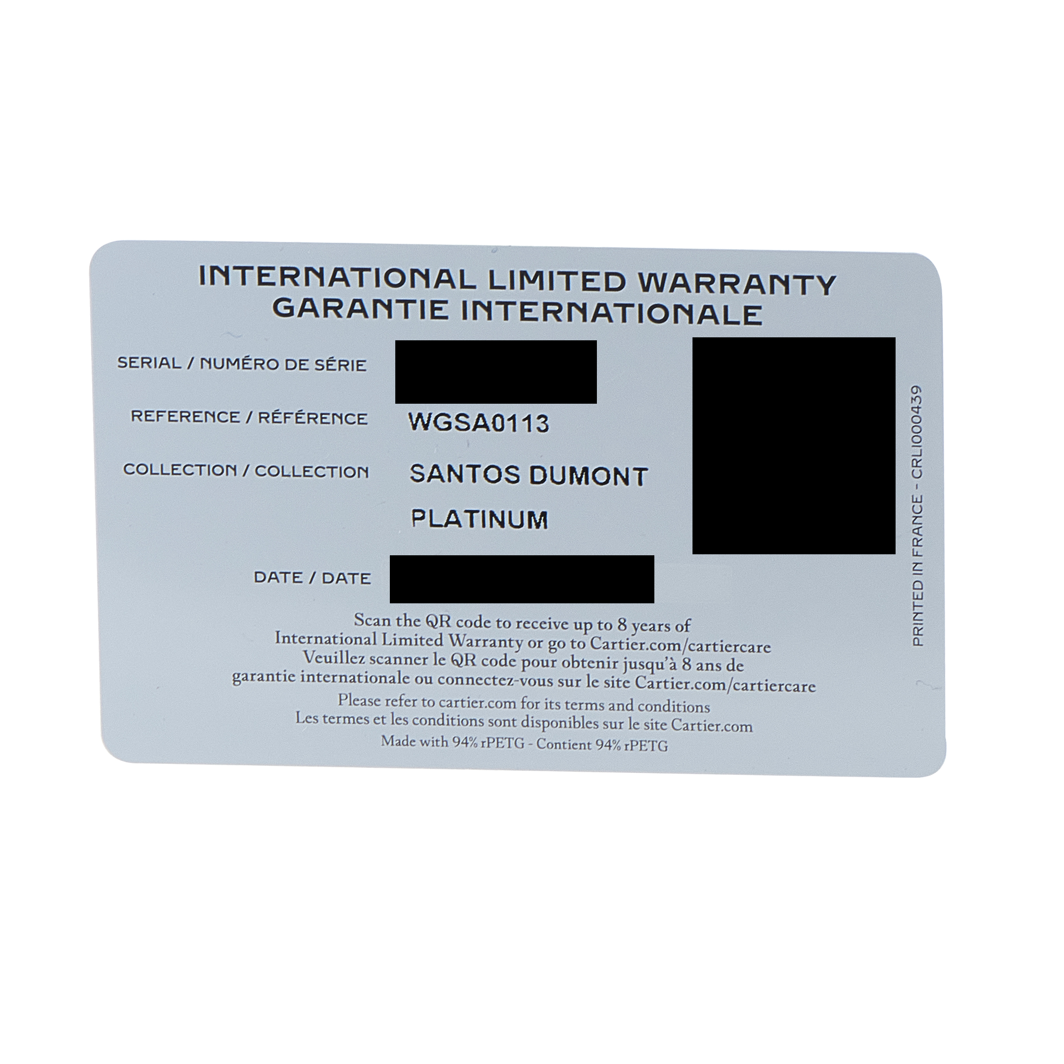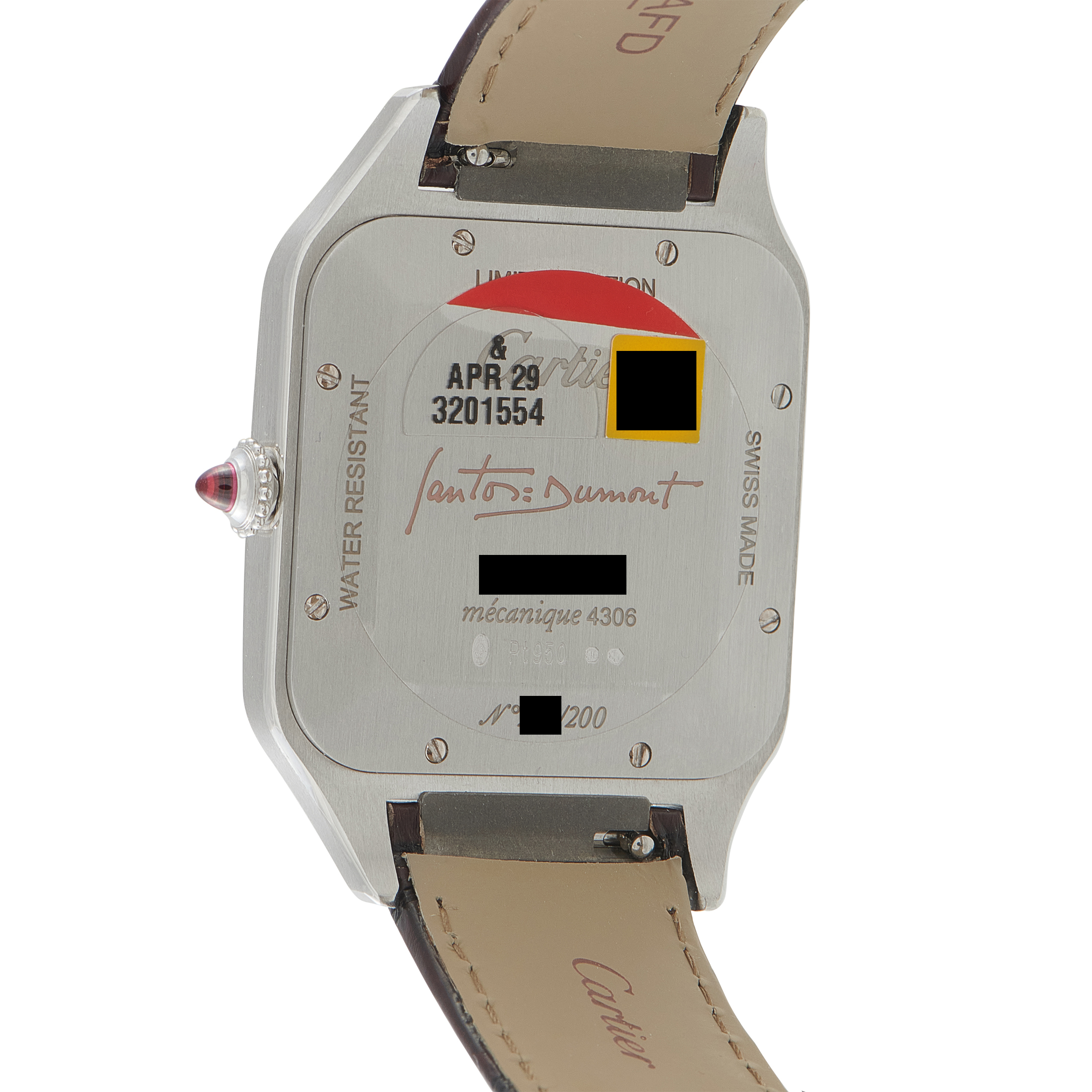 Limited to 200 numbered pieces, the Cartier Santos-Dumont XL WGSA0113 closes the series with this example marked 200/200. The extra-large platinum case measures 46.6 × 33.9 mm, carrying strong vertical lines, offset by a beaded crown set with a faceted ruby. Its copper-toned dial, warm and metallic, provides depth without distraction. The face is framed by slim, elongated Roman numerals and a railway-style minute track at the periphery. Inside is the manual-winding Calibre 430 MC, offering approximately 38 hours of power reserve.