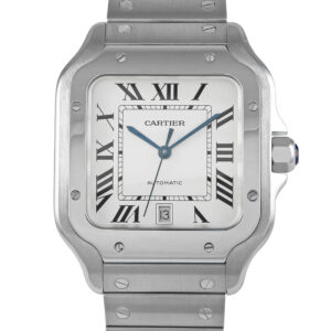 This pre-owned Cartier Santos de Cartier Large Model Watch WSSA0009 comes with papers, a bracelet changing tool, and the manufacturer’s box.