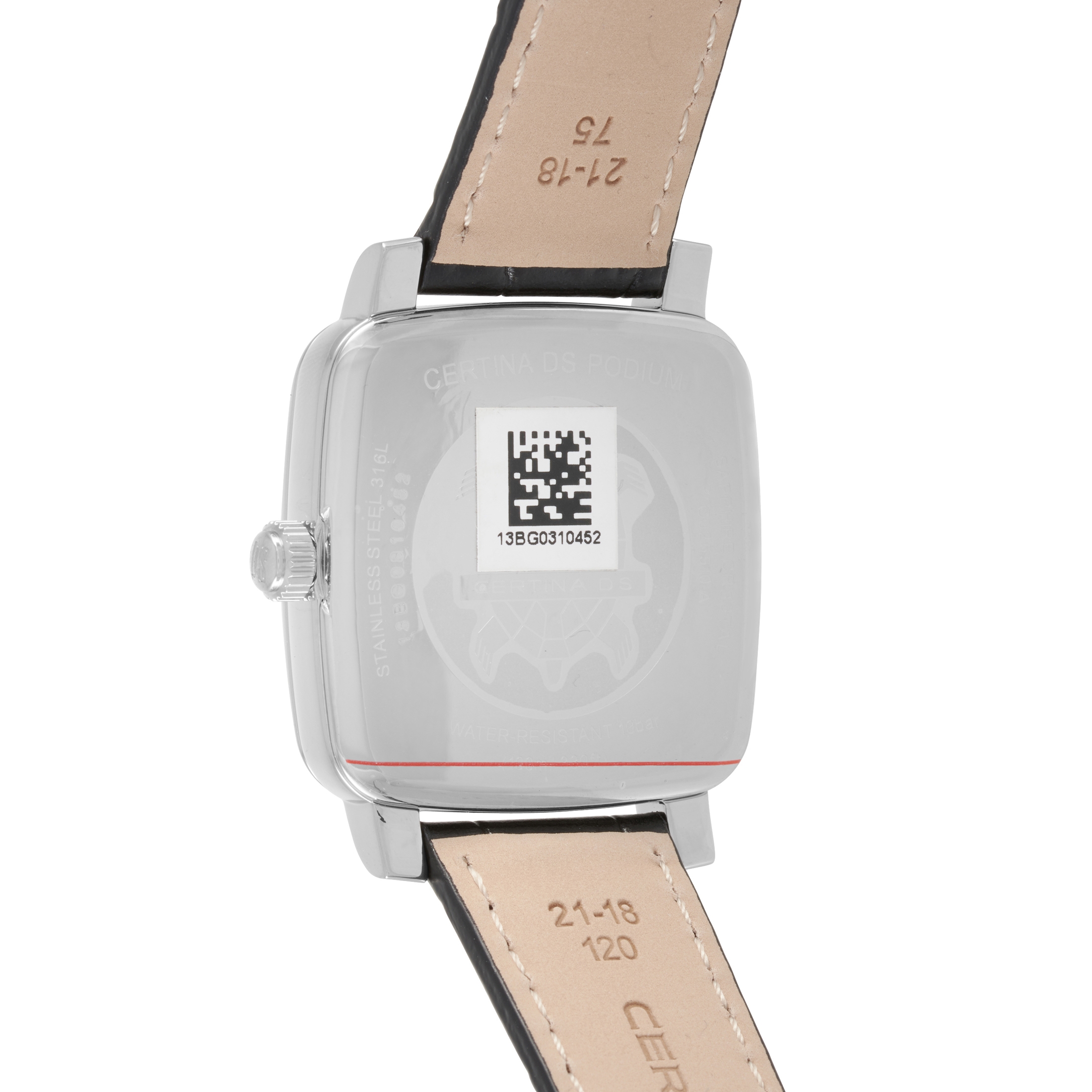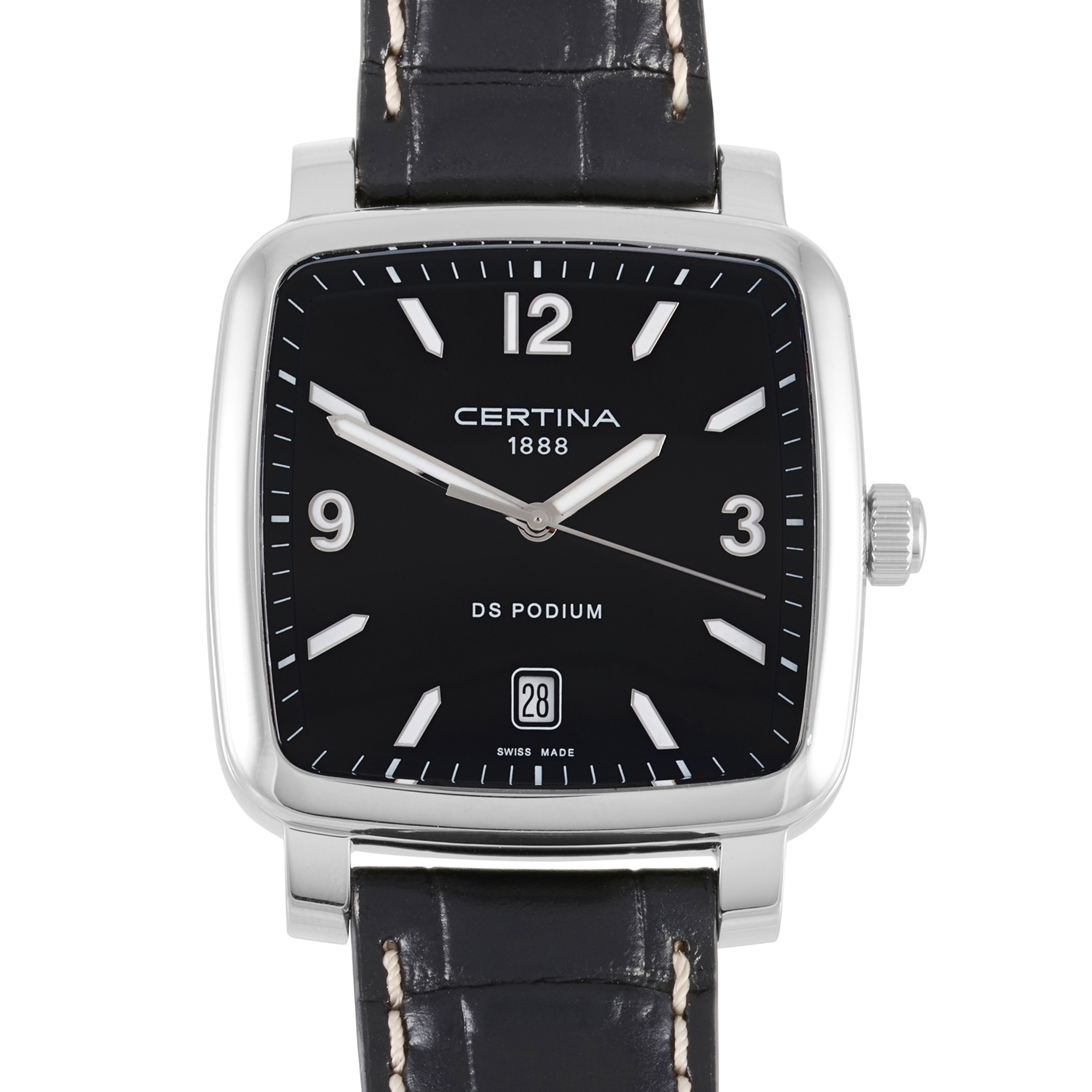 The Certina DS Podium watch, reference number C0255101605700, comes with a 34.50 mm stainless steel case presented on a black leather strap that is fitted with a deployment clasp. This model is powered by the ETA F06.111 quartz movement. The black dial with Arabic numerals features central hours, minutes and seconds, and date indication. The watch is water-resistant to 100 meters.