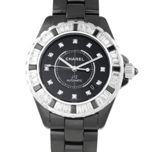 The Chanel J12 ref.H2023 bridges the worlds of haute horlogerie and haute joaillerie. This timepiece features a 38mm black ceramic case and bracelet paired with an 18K white gold bezel richly set with 36 baguette-cut diamonds. It frames a glossy black lacquered dial with diamond hour markers, a minute track, luminous hands, and a date window between 4 and 5 o’clock. At its core beats an automatic movement, Caliber 12.1, delivering approximately 70 hours of power reserve.