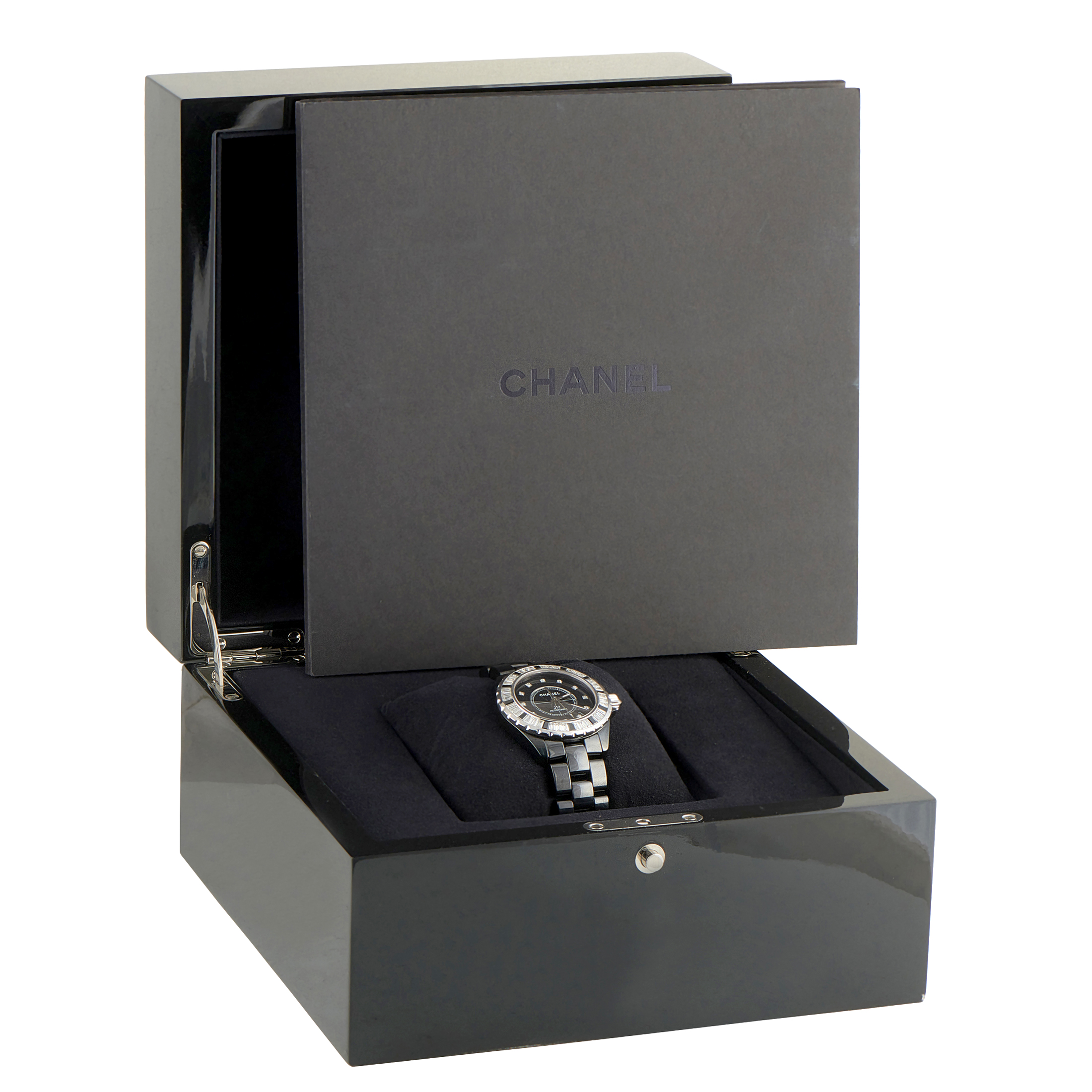 Papers and the manufacturer’s box accompany this pre-owned Chanel J12 Joaillerie Diamond and Black Ceramic Watch H2023.
