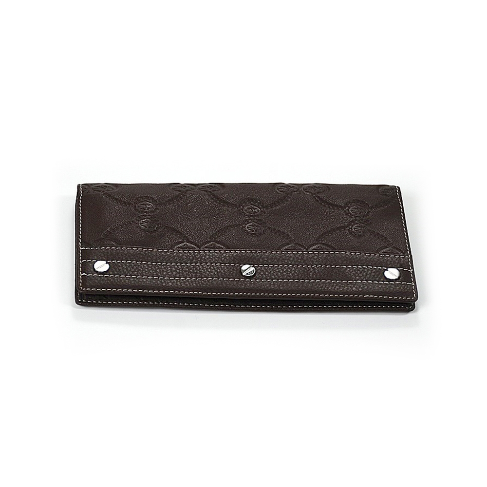 Stamped cafe brown leather wallet features silver screw detail on the front and back, as well as the Charriol logo.