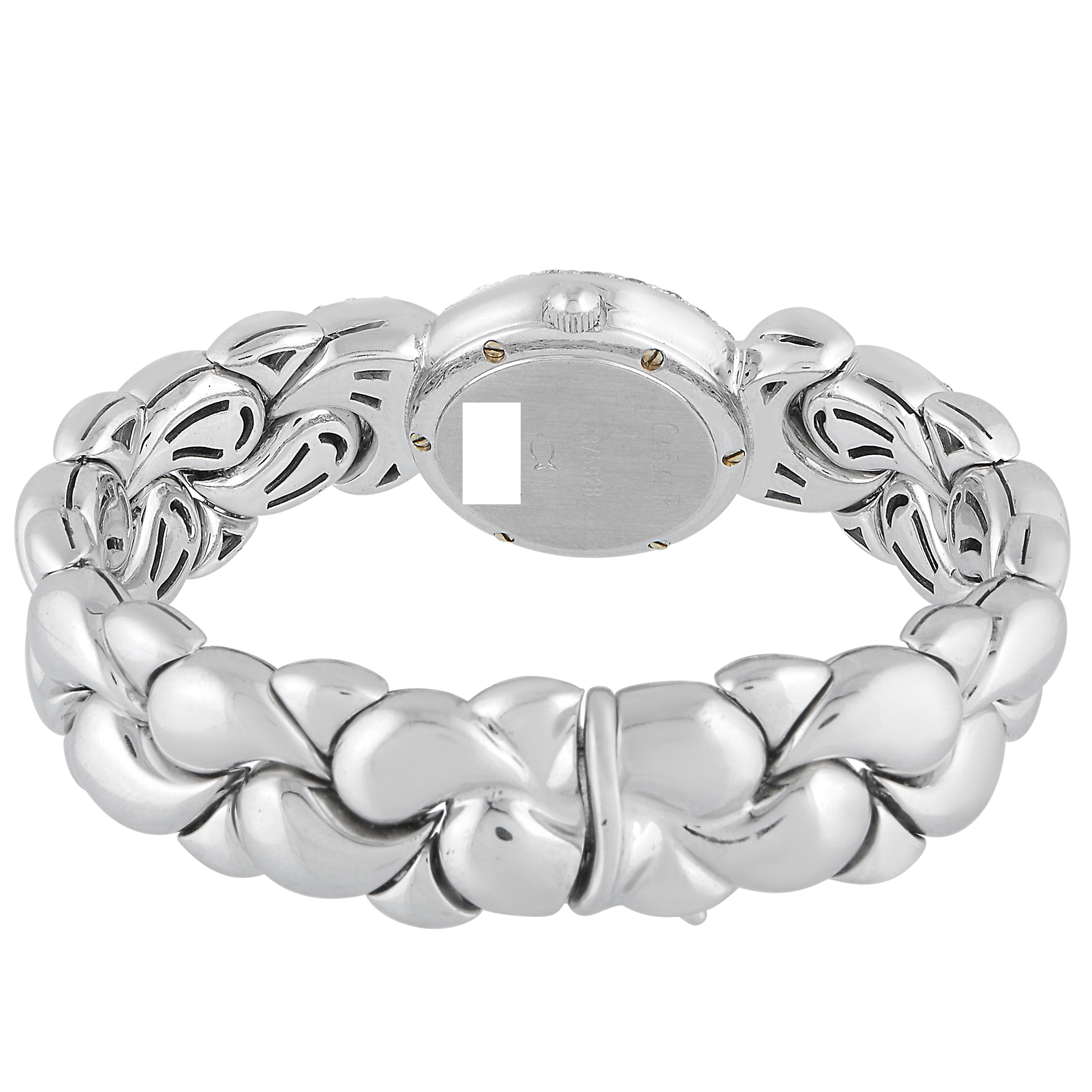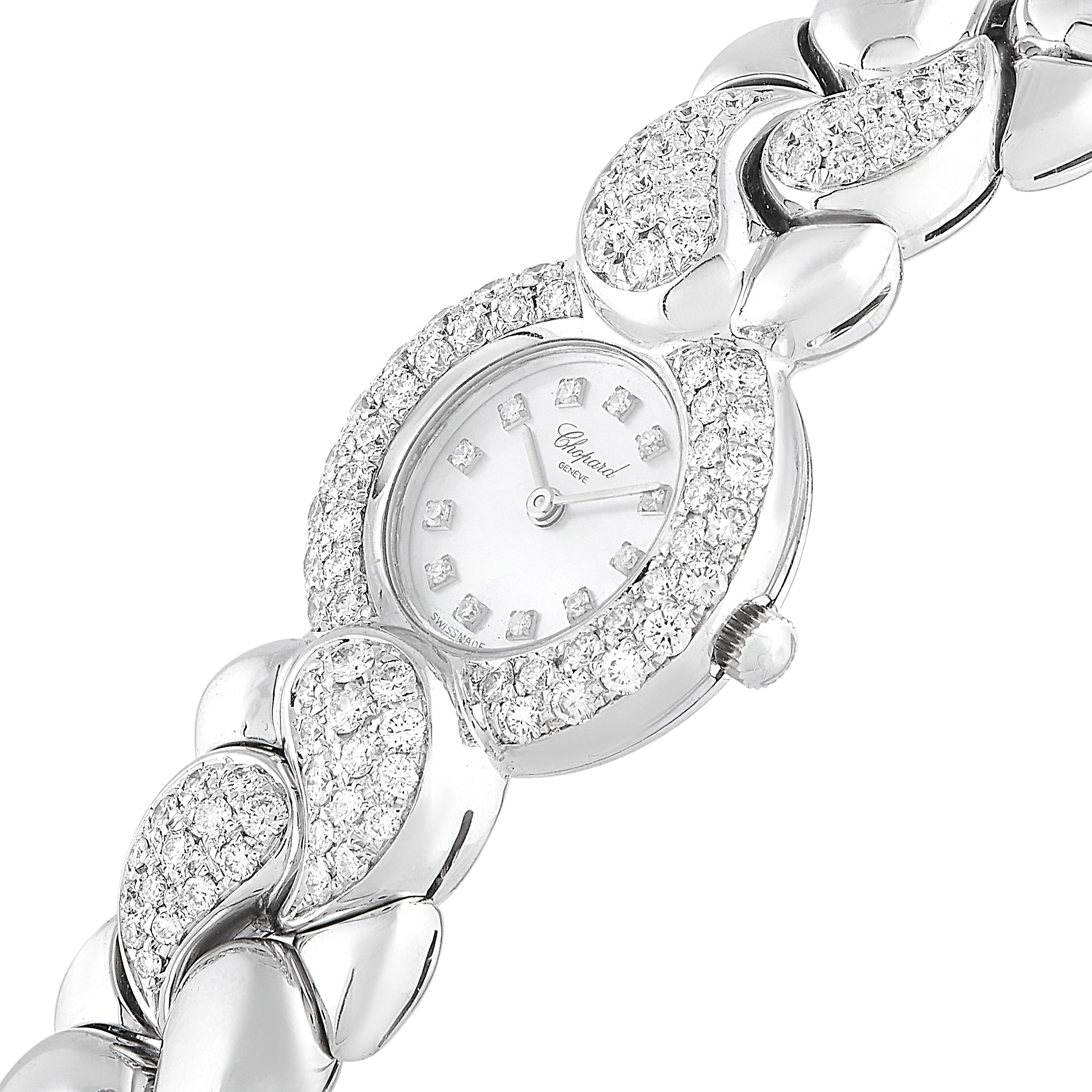 The Chopard Casmir watch, reference number 443392 917-1, comes with a water-resistant 18K white gold case that measures 23 mm in diameter. The case is embellished with diamonds and presented on a matching diamond-embellished 18K white gold bracelet. This model is equipped with a quartz movement and indicates hours and minutes on the white dial with diamond hour-markers. The watch is set with diamond stones that boast E color and VVS clarity and weigh 1.25 carats in total.