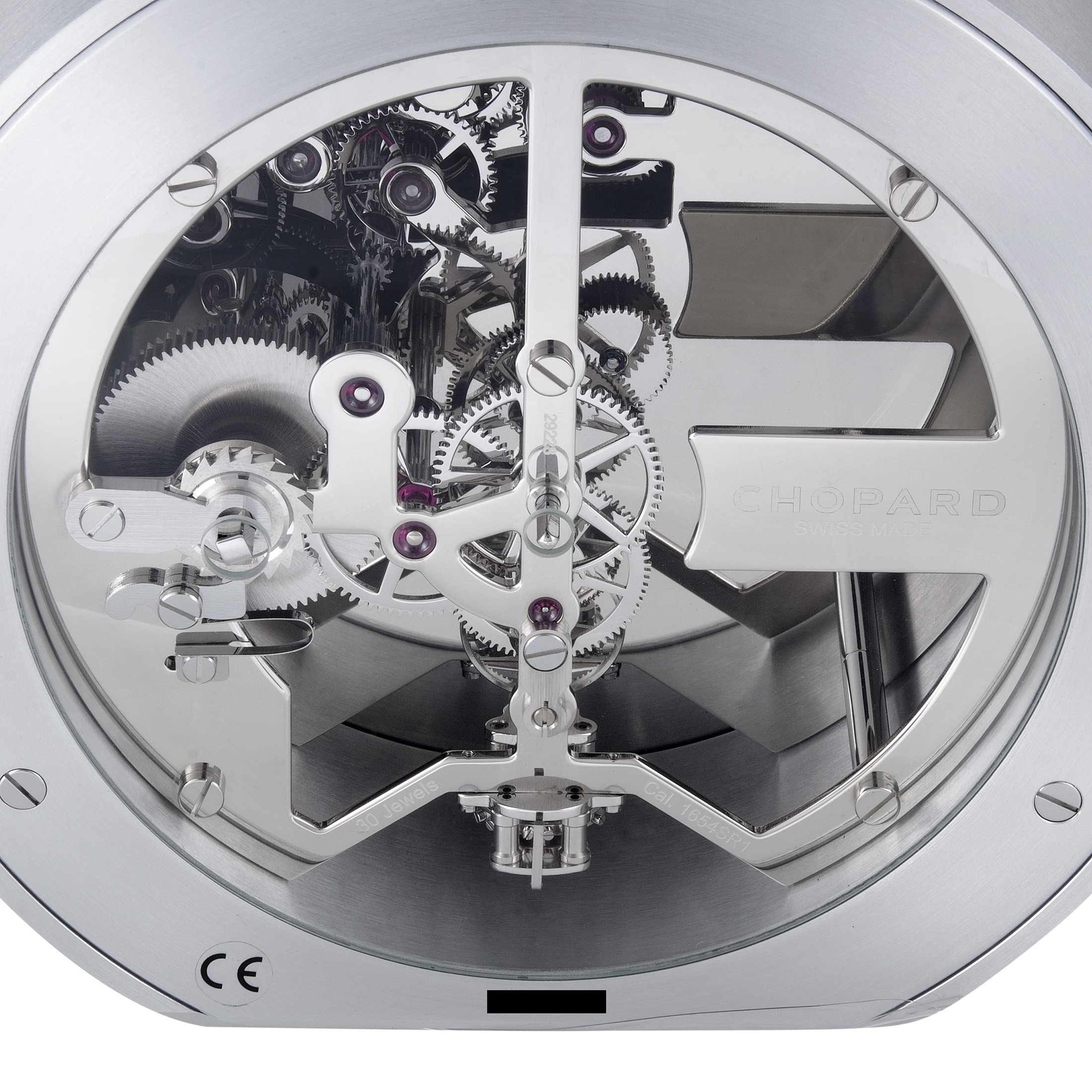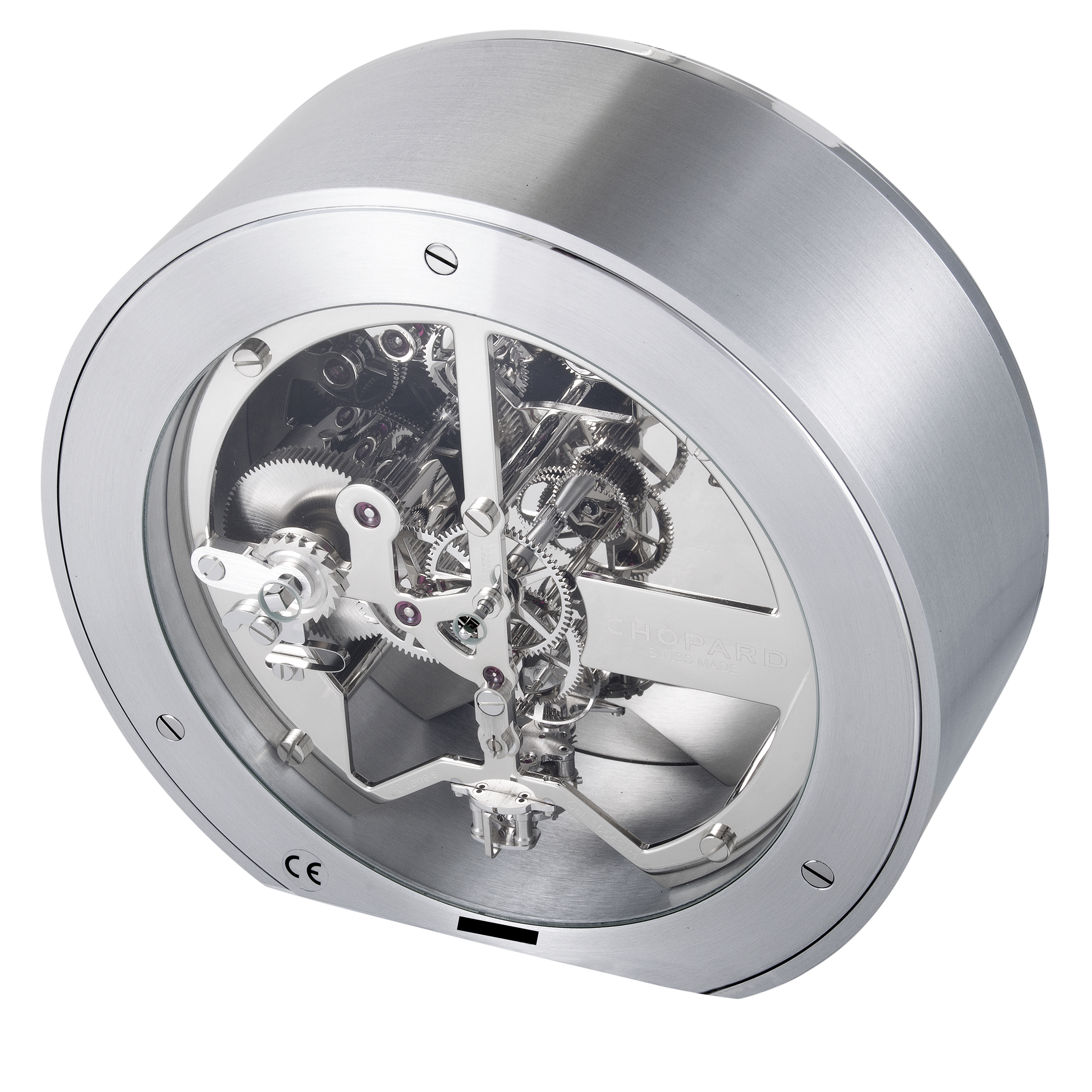 An irresistible view for any watchmaking connoisseur is provided at the transparent case back of this amazing piece from Chopard which is inspired by the brands L.U.C. collection and introduced as their first table clock with a hand-wound mechanical movement. Openworked for an intriguing show and nested inside a 16cm case with satin-brushed aluminum finish, the mechanism drives the hands upon the ivory-toned dial which shows central hours and minutes and small seconds at six oclock while the stunning 8-day power reserve can be monitored via a display at the 12 oclock position.