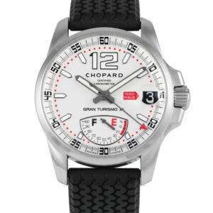 A car lover’s watch. Chopard’s Mille Miglia Gran Turismo XL Power Reserve ref.168457-3002 features a 44mm-wide polished stainless steel case, worn on a rubber strap with a tire tread pattern. It has a tiered white dial with a black date window, luminous hour markers and hands, and a power reserve display inspired by a race car’s fuel gauge. The watch runs on a ETA 2897, a COSC-certified automatic movement with an approximate power reserve of 46 hours.
