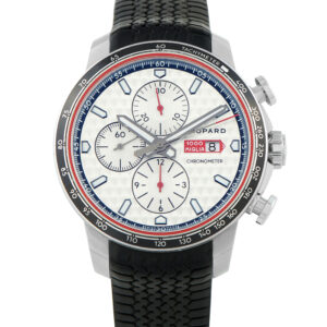 The Chopard Mille Miglia GTS Chrono Limited Edition ref. 168571-3002 is a 1000-piece series that celebrates the enduring link between fine watchmaking and classic motorsport. This sporty chronograph is water-resistant to 100 meters and runs on an automatic movement that powers the time, date, and stopwatch functions with accuracy. Its 44 mm stainless steel case features bold lines, pushers shaped like engine parts, and a large fluted crown that recalls a vintage fuel cap. The bezel, fitted with a black aluminum insert and tachymeter scale, reinforces its racing intent. The silver-toned dial features an engine-turned finish of overlapping circles, detailed with baton hands and Super-LumiNova hour markers for legibility. Snailed counters and the Mille Miglia’s signature red accents recall a classic dashboard, giving the watch its distinctive character. A black rubber strap embossed with a 1960s Dunlop tire tread pattern completes the watch.