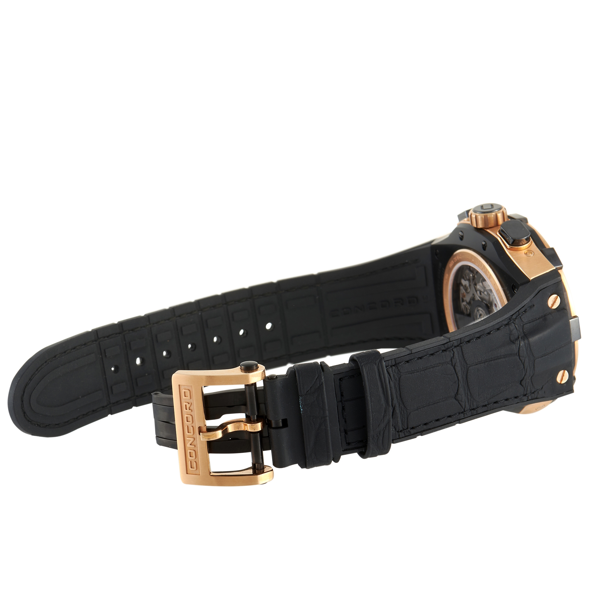 There are only 25 pieces of Concord C1 Perpetual Calendar Chronograph 01.6.52.1086 ever made. Here is your chance to own one. This watch has a 47mm case in 18K pink gold and PVD-coated titanium. The dark grey textured dial displays time, day, date, and moon phase. It features a perpetual calendar and a leap year indication. The transparent case back is secured by eight screws. The watch is fitted with a black Concord rubber strap with 18K pink rose and PVD-coated titanium double-folding buckle. Powering this timepiece is caliber 288 automatic movement with 26 jewels and approximately 48 hours of power reserve.