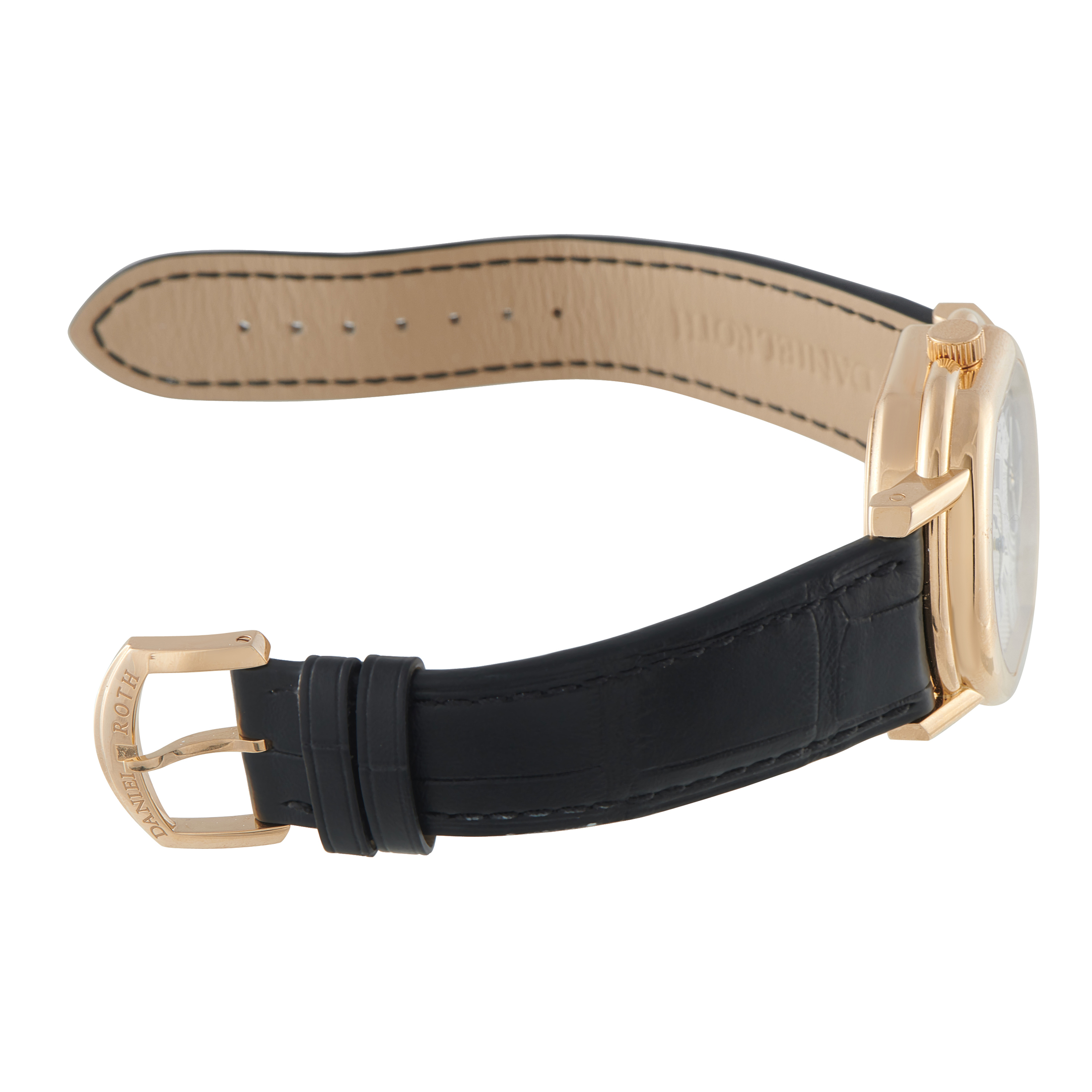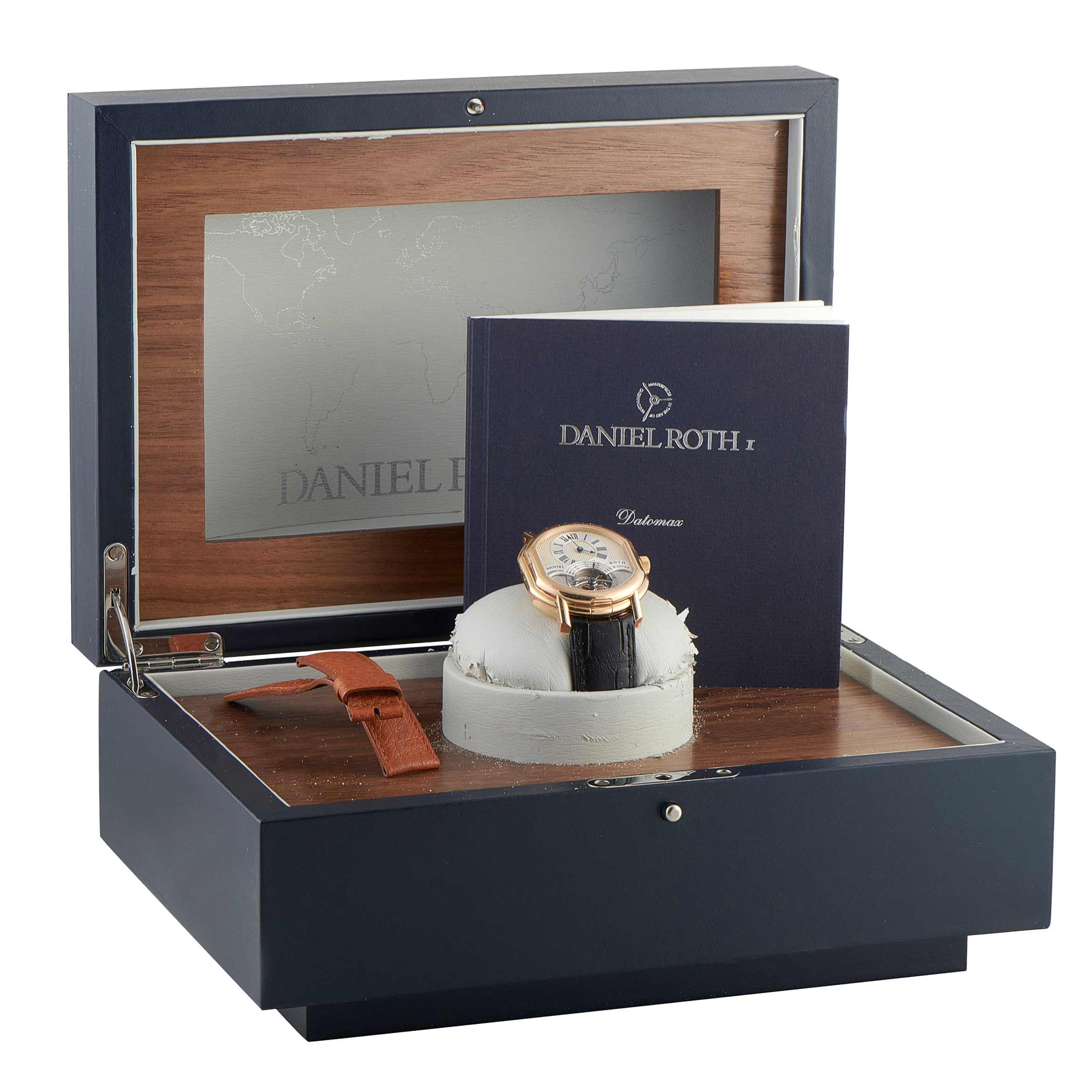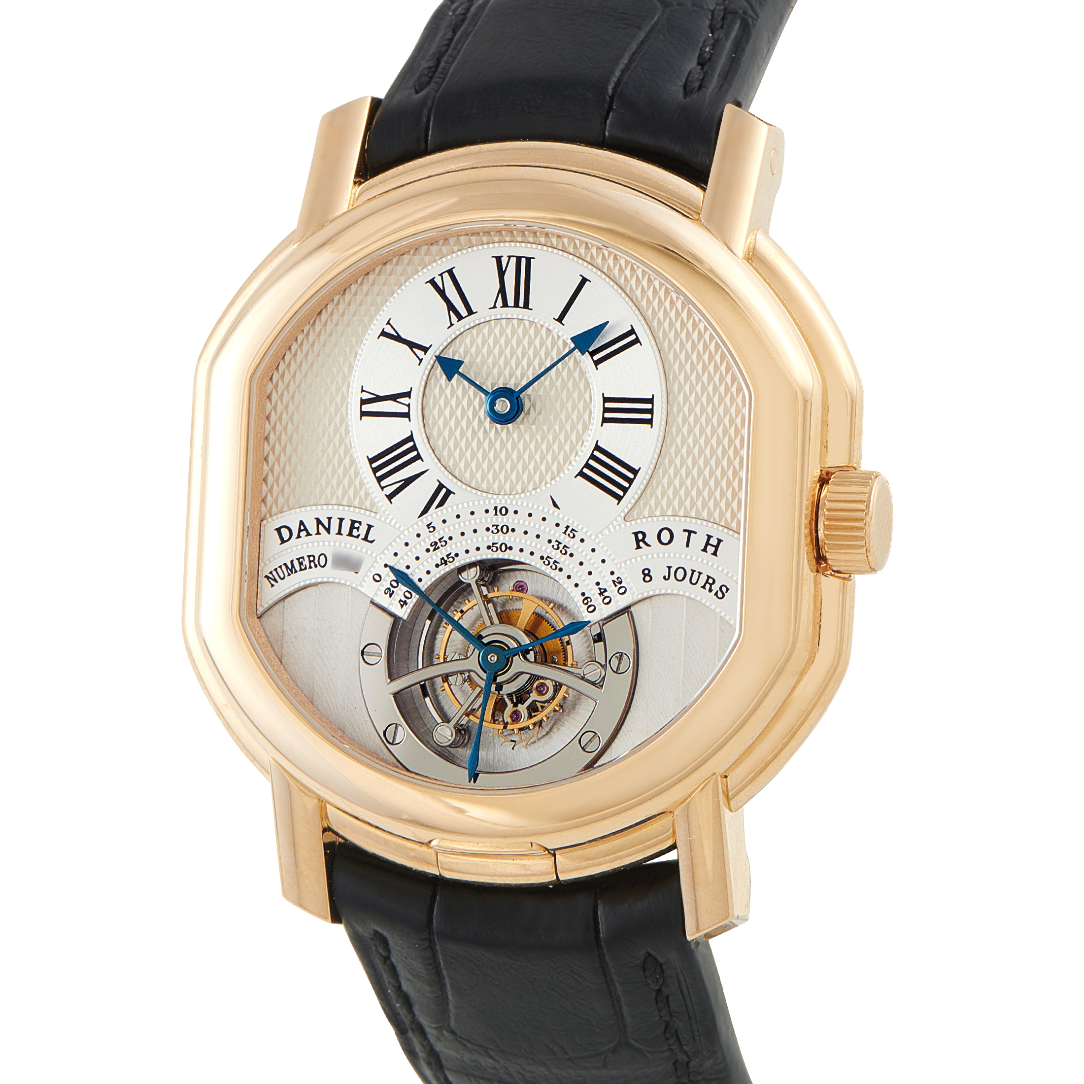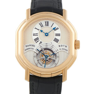 This pre-owned Daniel Roth Regulateur Tourbillon Rose Gold Watch 197.X.40 comes with papers, extra leather strap, and the manufacturer’s wooden presentation box.