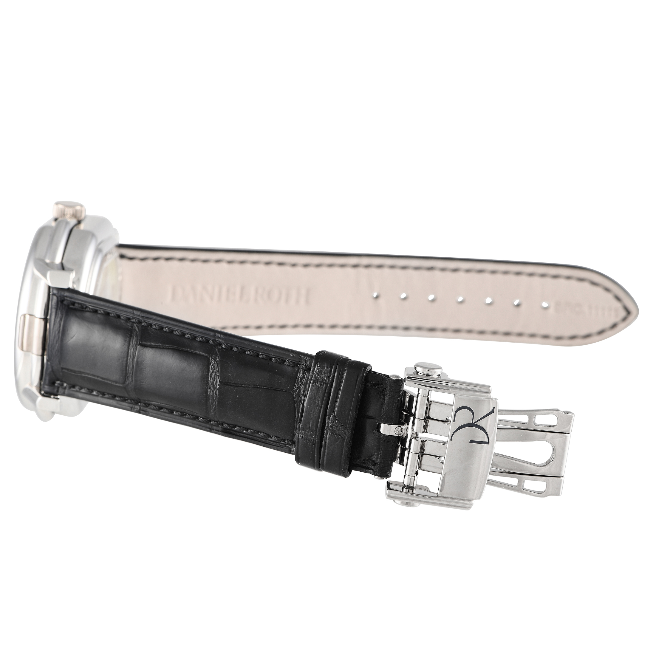 This pre-owned Daniel Roth Tourbillon Piece Unique Platinum Watch 197.X.70.181.CN.BA.E02 is accompanied by papers and a gift box.