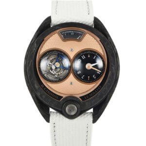 The DC6 Half Hunter boasts a design as daring and intricate as the spirit and technical knowledge of its maker, David Candaux. The watch features a 43mm carbon and rose gold case, a beautiful rose gold guilloché dial, and domed sapphire crystals for the two sub-dials. There is a power reserve indicator at 12 o’clock, an hour and minute sub-dial at 3, a 30-degree inclined tourbillon at 9, and the unconventional retractable “Magic Crown” at 6 o’clock. The watch has a manual-winding movement that offers 55 hours of power reserve. This modern timepiece is limited to only eight pieces.