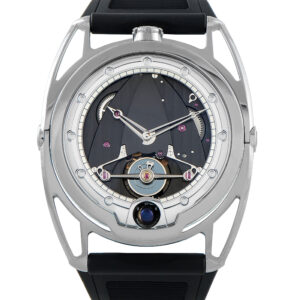 A watch that merges the finest traditions of Swiss watchmaking with space-age aesthetics. De Bethune’s DB28 in titanium features a substantial 42.6mm case that feels unexpectedly light and comfortable even on smaller wrists. It has De Bethune’s patented spring-loaded floating lugs that pivot to match the wearer’s wrist perfectly. This industry icon also boasts the brand’s signature spherical moon phase with a 3D ball made of palladium and flame-blued steel. Driving the watch is the hand-wound Caliber DB2115V4, with 285 components and a generous 6-day power reserve provided by self-regulating twin barrels.
