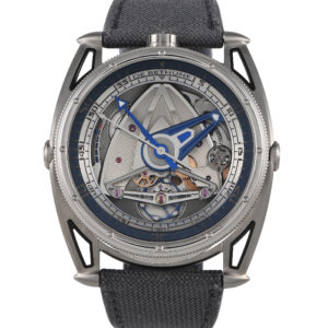 This impeccable timepiece boasts a decidedly futuristic sense of style thanks to the 44mm titanium case and uniquely designed skeleton dial, which features cut-out Arabic numerals, blue toned hands with luminescent tips, and a power-reserve indicator between 9 and 10-o-clock position. For maximum visibility, it offers multiple illumination options – including a photoluminescent “Blue Moon” accent. This timepiece is powered by De Bethune’s DB2080 hand-wound movement and offers 100 meters of water resistance as well as a unidirectional dive bezel.