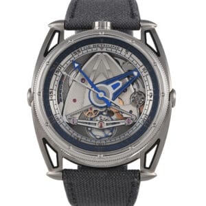 This impeccable timepiece boasts a decidedly futuristic sense of style thanks to the 44mm titanium case and uniquely designed skeleton dial, which features cut-out Arabic numerals, blue toned hands with luminescent tips, and a power-reserve indicator between 9 and 10-o-clock position. For maximum visibility, it offers multiple illumination options – including a photoluminescent “Blue Moon” accent. This timepiece is powered by De Bethune’s DB2080 hand-wound movement and offers 100 meters of water resistance as well as a unidirectional dive bezel.