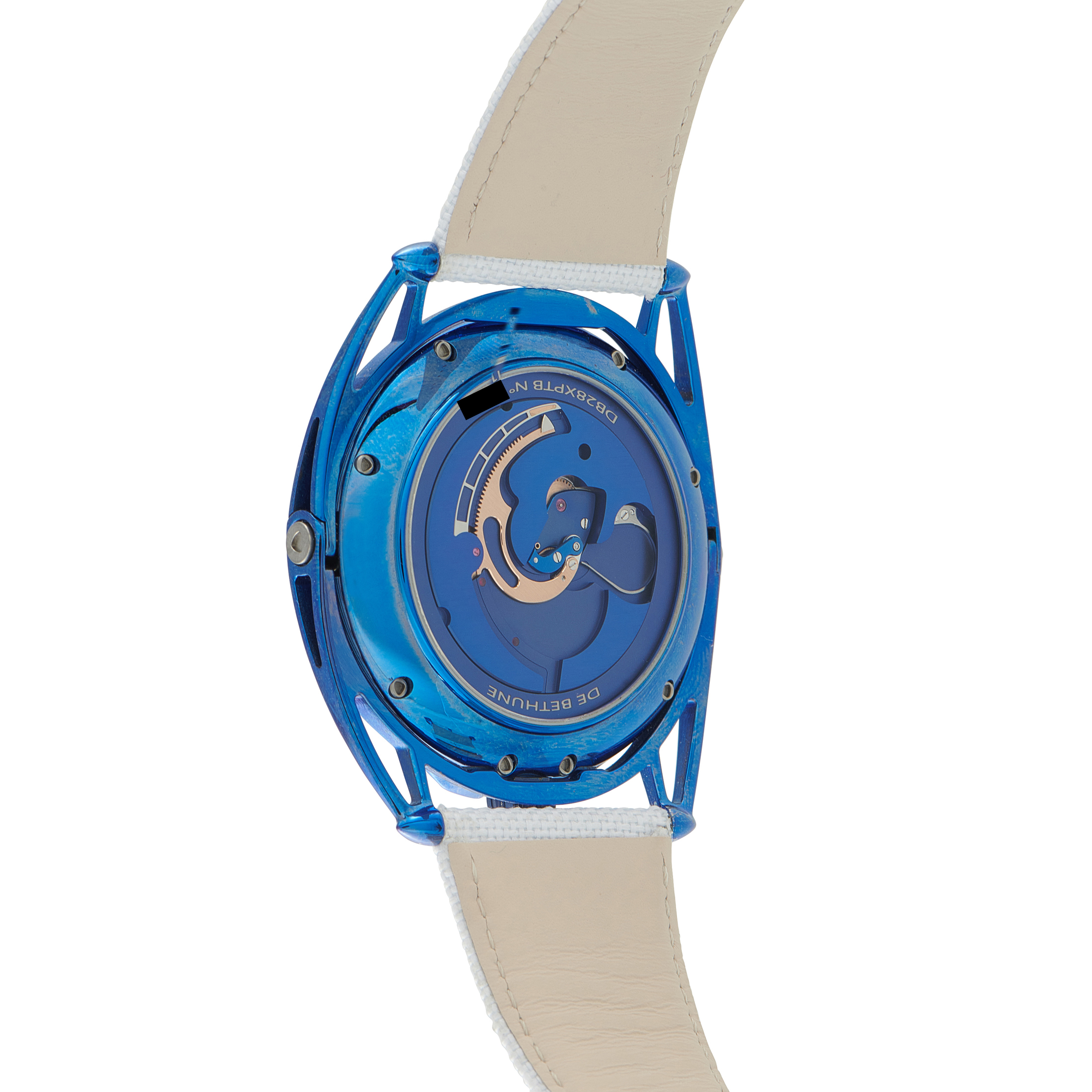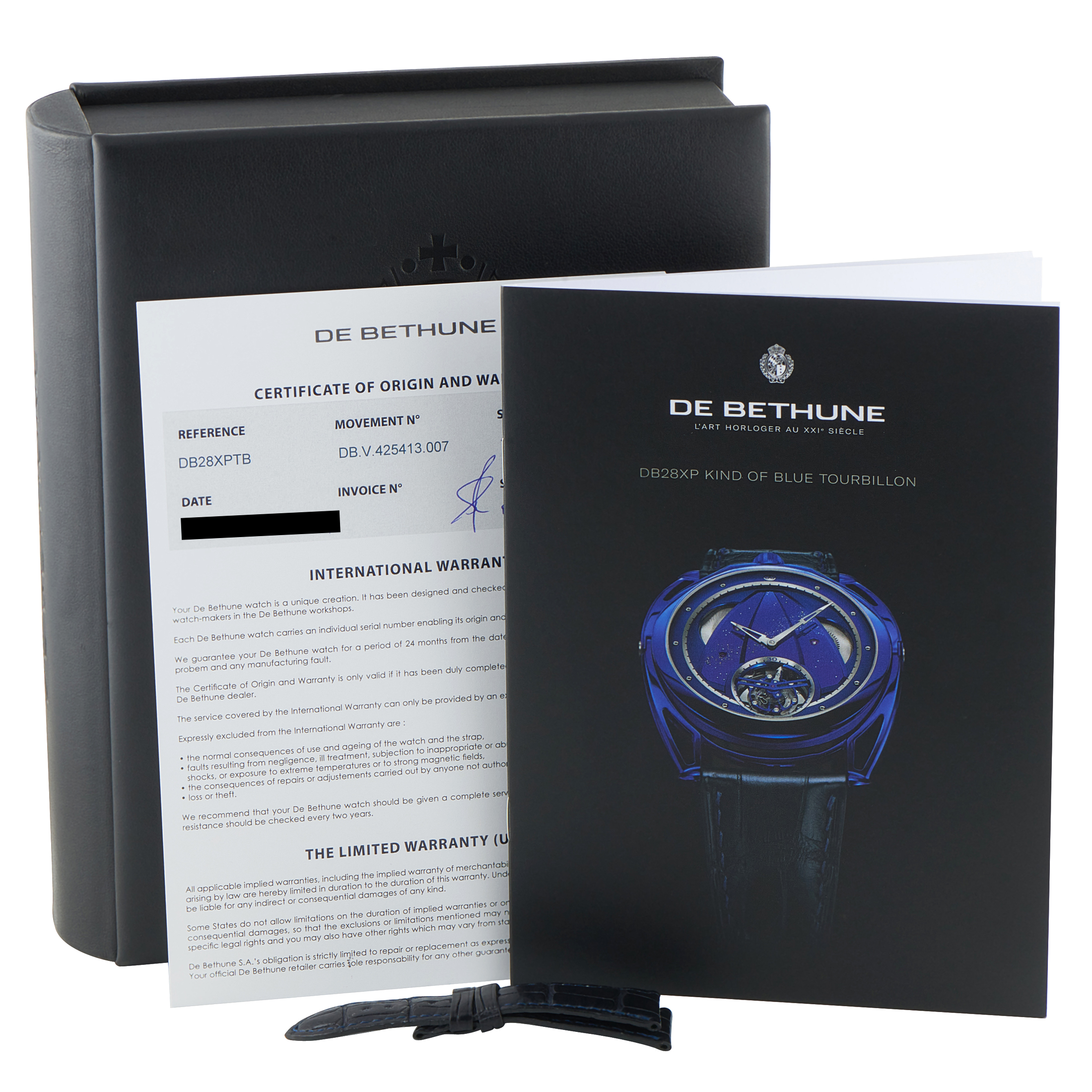 Papers, extra strap, and the manufacturer’s box accompany this pre-owned De Bethune Kind of Blue Tourbillon Watch db28xptb.