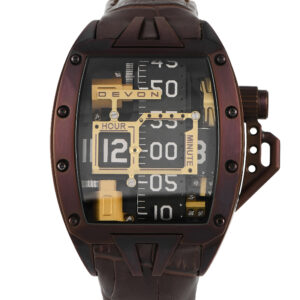 Introduced in 2014, here is a chocolate brown version of Devon Works’ Tread 2 watch. This timepiece has a 44 mm x 42 mm x 14.5 mm case in 316L steel finished with a chocolate brown PVD coating. The watch is attached to a brown croc-embossed leather strap. Rounding out the chocolate theme is a chocolate brown time belt on the dial. Hours are displayed via a horizontal belt, and the minutes are displayed through a vertical belt. The Devon Tread 2 “Godiva” watch runs on a battery-powered movement with a lithium-polymer rechargeable battery. It has 28 days of power reserve.