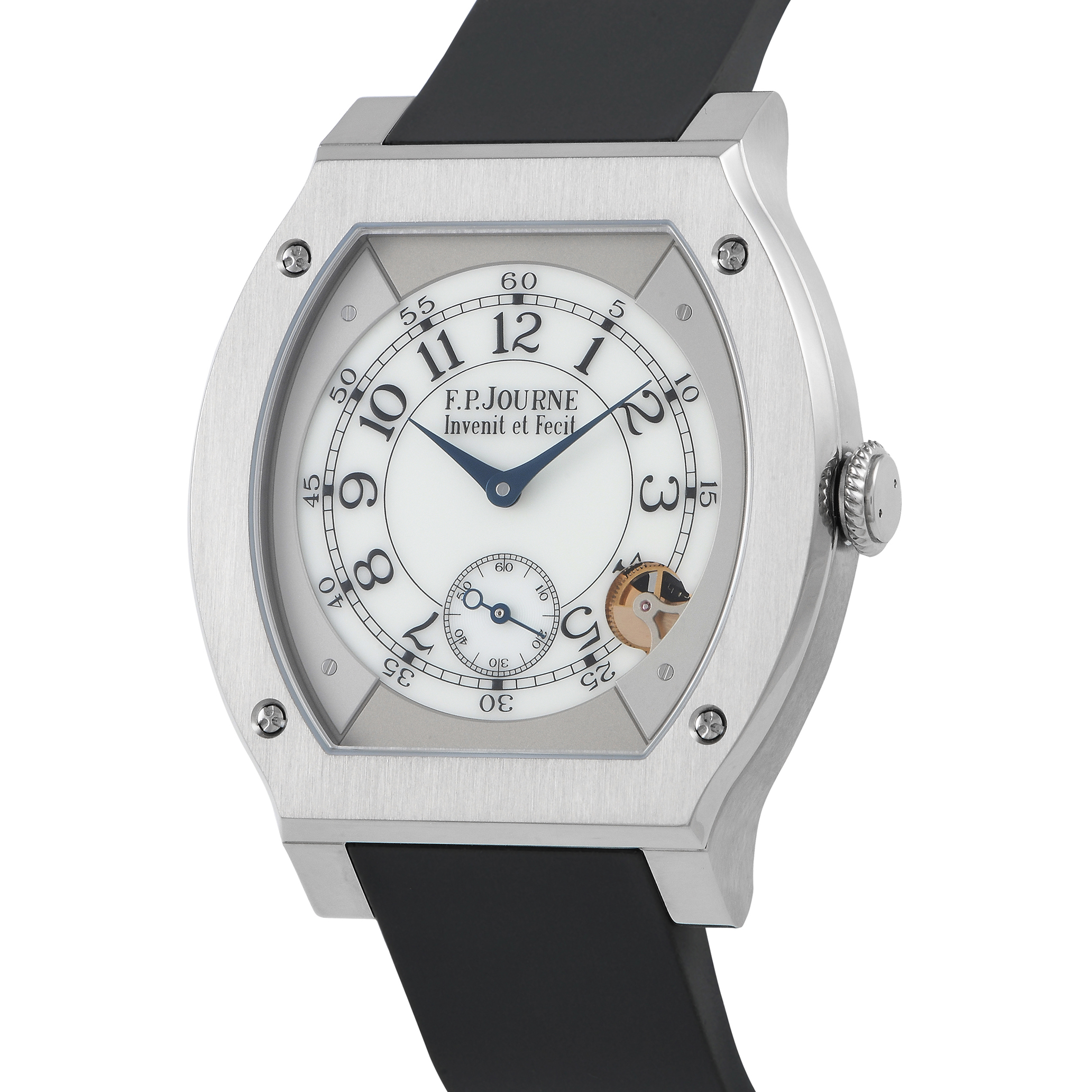 True to its name, F.P. Journe’s Élégante 48 offers a smart and stylish look with its grade 5 titanium case and legible white dial bearing Arabic numeral hour markers in F.P. Journe signature font. The attractive face of the watch features a screwed outer dial with a luminescent white center housing blued steel hands and a small seconds sub-dial at 6. Inside the flat Tortue® case is the hybrid quartz caliber 1210, an electromechanical movement with a mechanical motion detector that allows the watch to go on stand-by mode after 35 minutes of inactivity. This model is supplied with a black rubber strap.