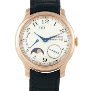 On the whitened guilloché silver dial is F.P. Journe’s signature asymmetrical layout. Blued steel hands track the time alongside a large date, moon phase, and power reserve indicator.