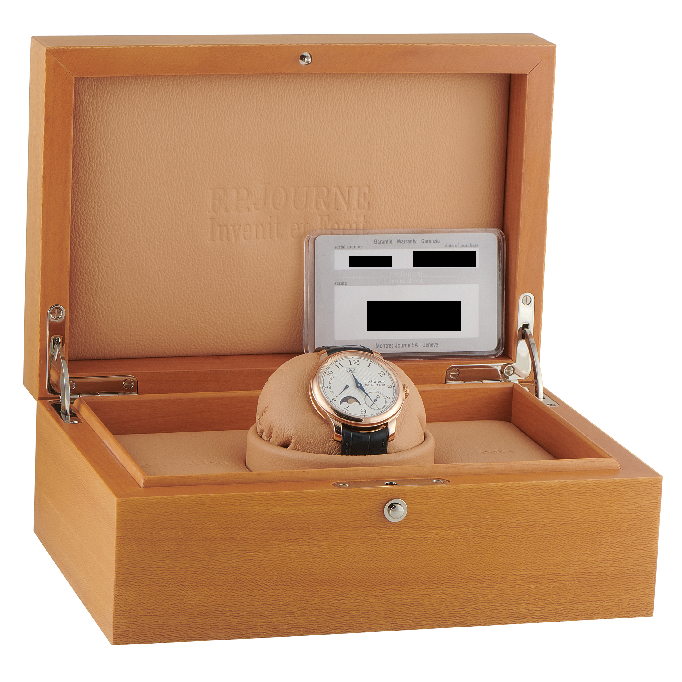 Papers and the manufacturer’s box accompany this pre-owned F.P. Journe Octa Automatique Lune Rose Gold Watch AL2.