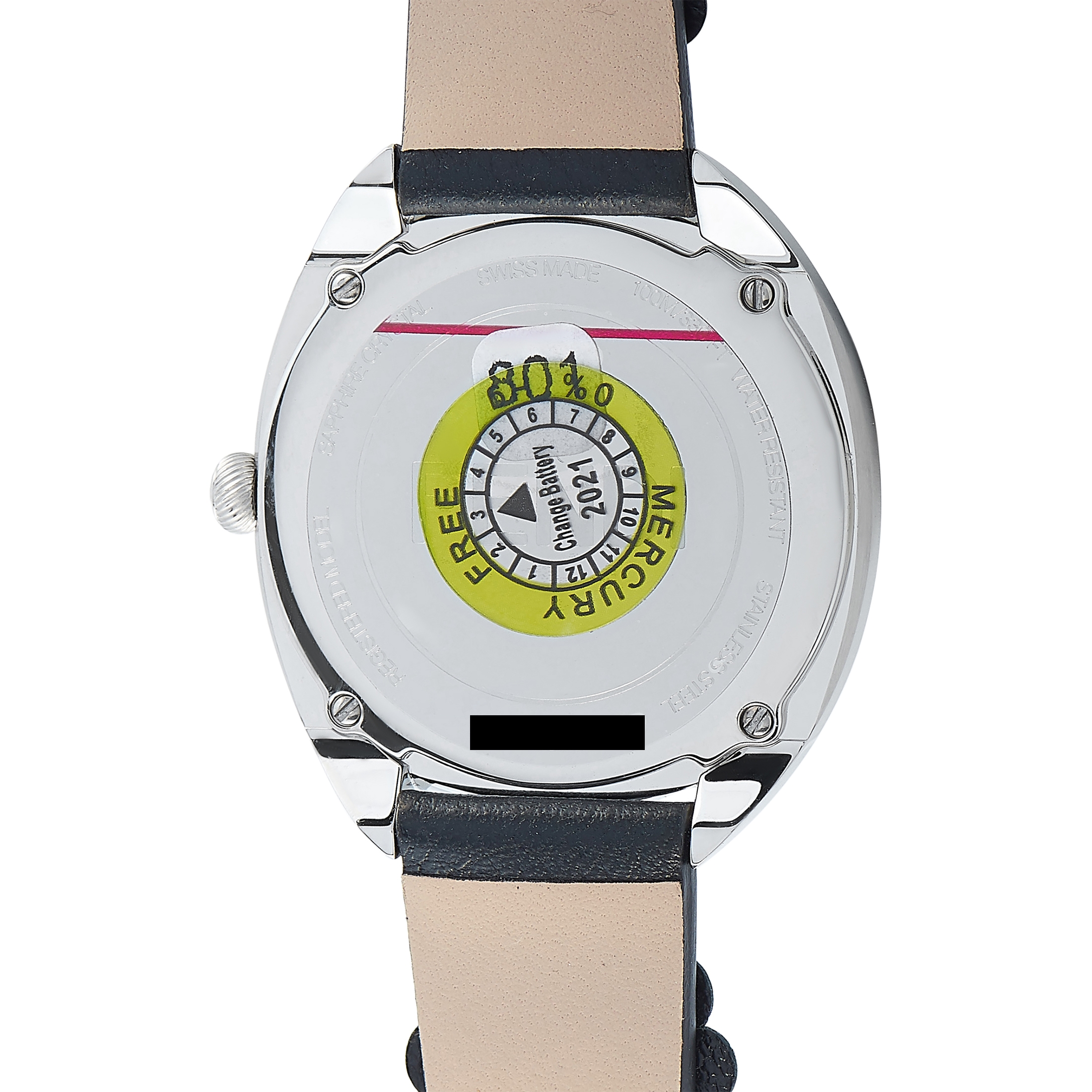 It is presented with a 34 mm stainless steel case that offers water resistance of 100 meters. The watch is worn on a black leather strap fitted with a tang buckle. The black dial is embellished with colorful flowers and features central hours, minutes and seconds. This model is equipped with a quartz movement.