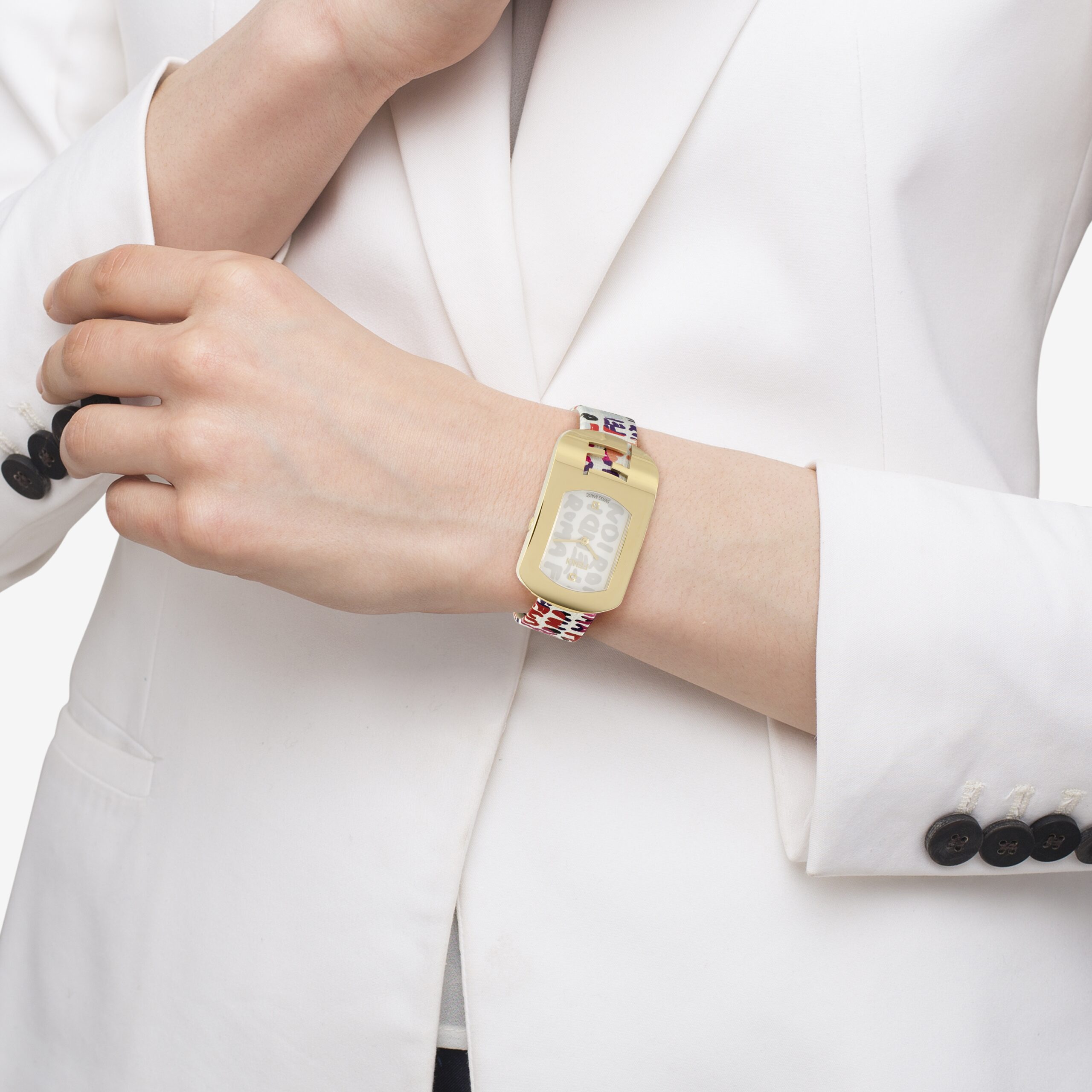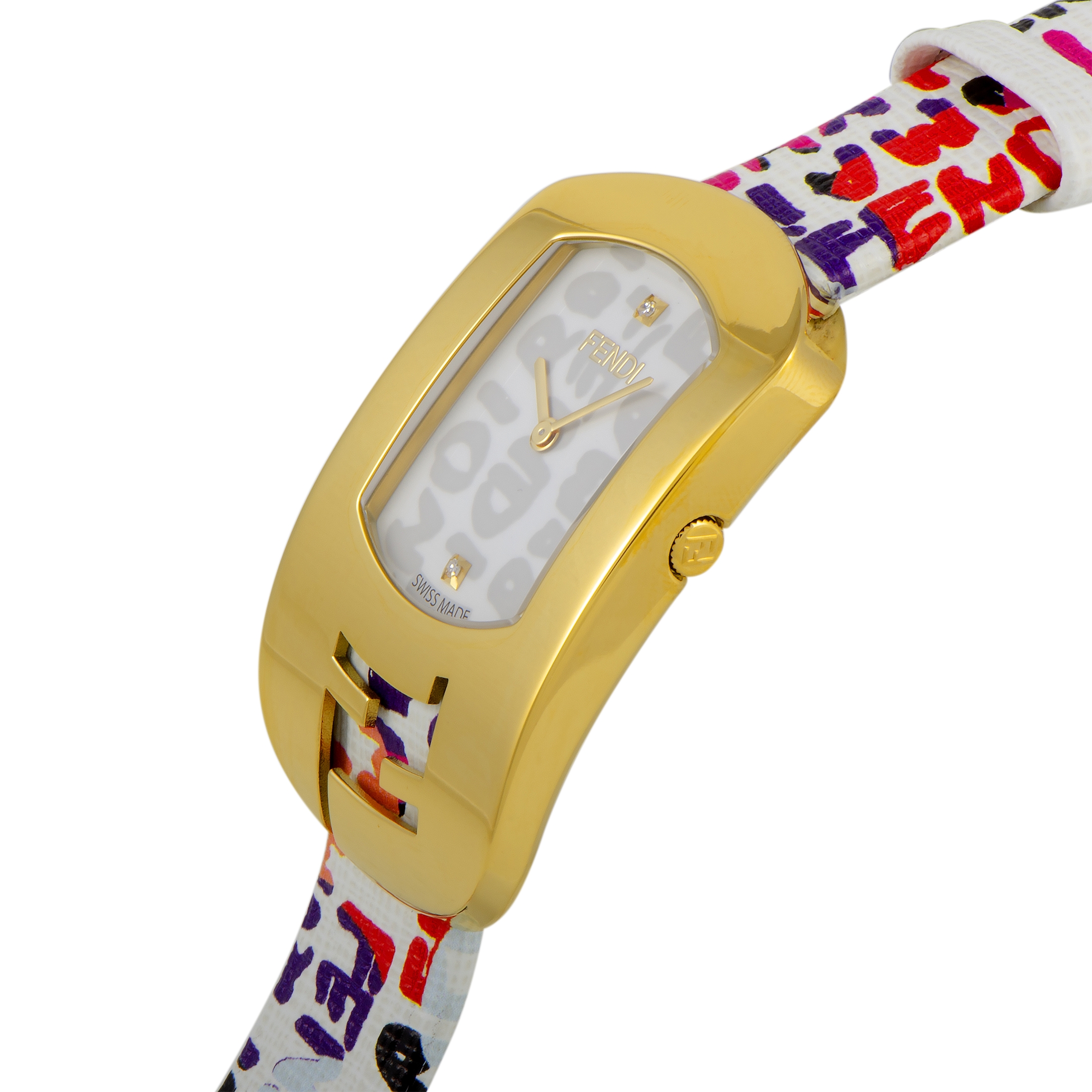 It is presented with a gold-tone stainless steel case that offers water resistance of 30 meters. The watch is worn on a white leather strap that boasts multicolor decorations and is fitted with a tang buckle. The white dial is accentuated with diamonds and features central hours and minutes. This model is equipped with a quartz movement.
