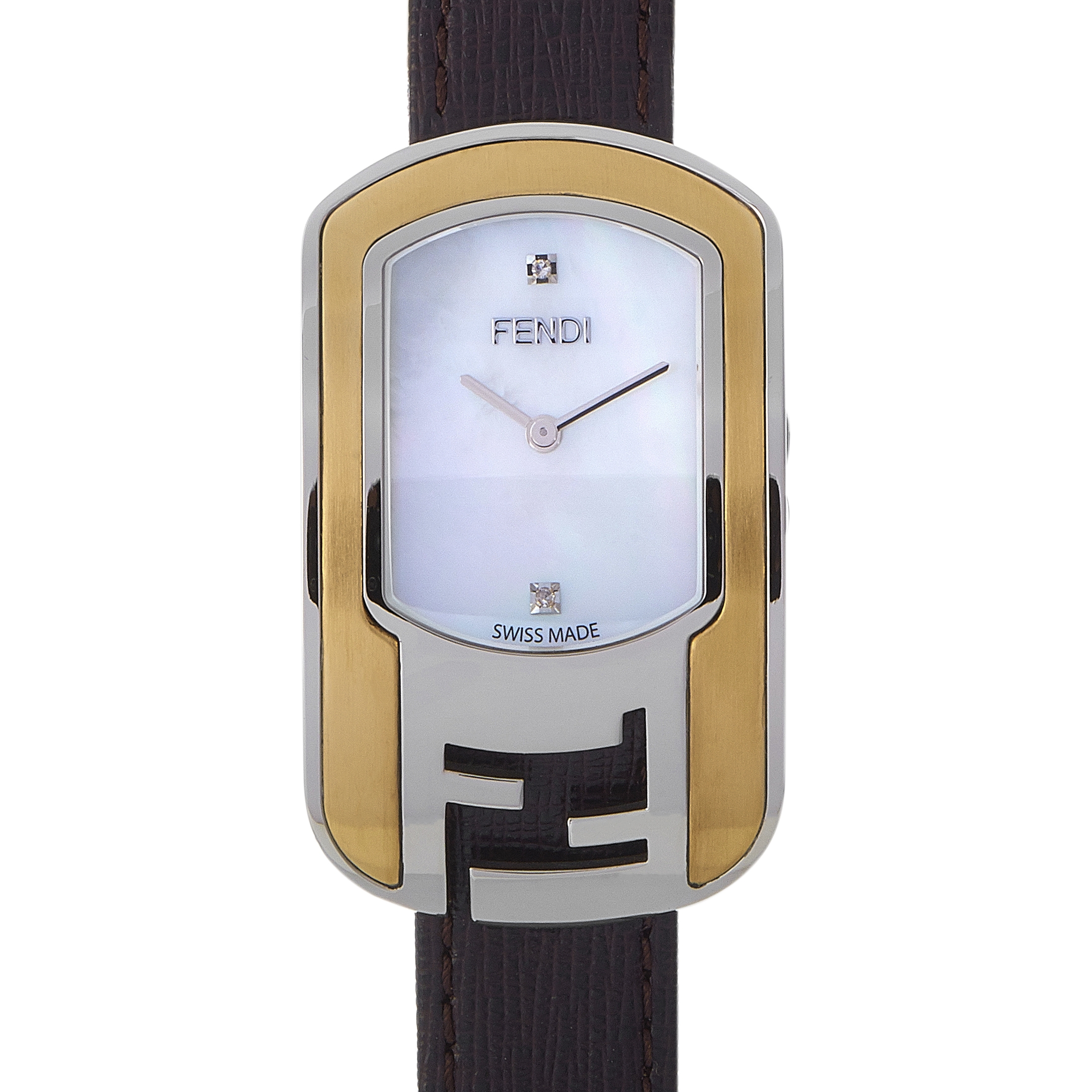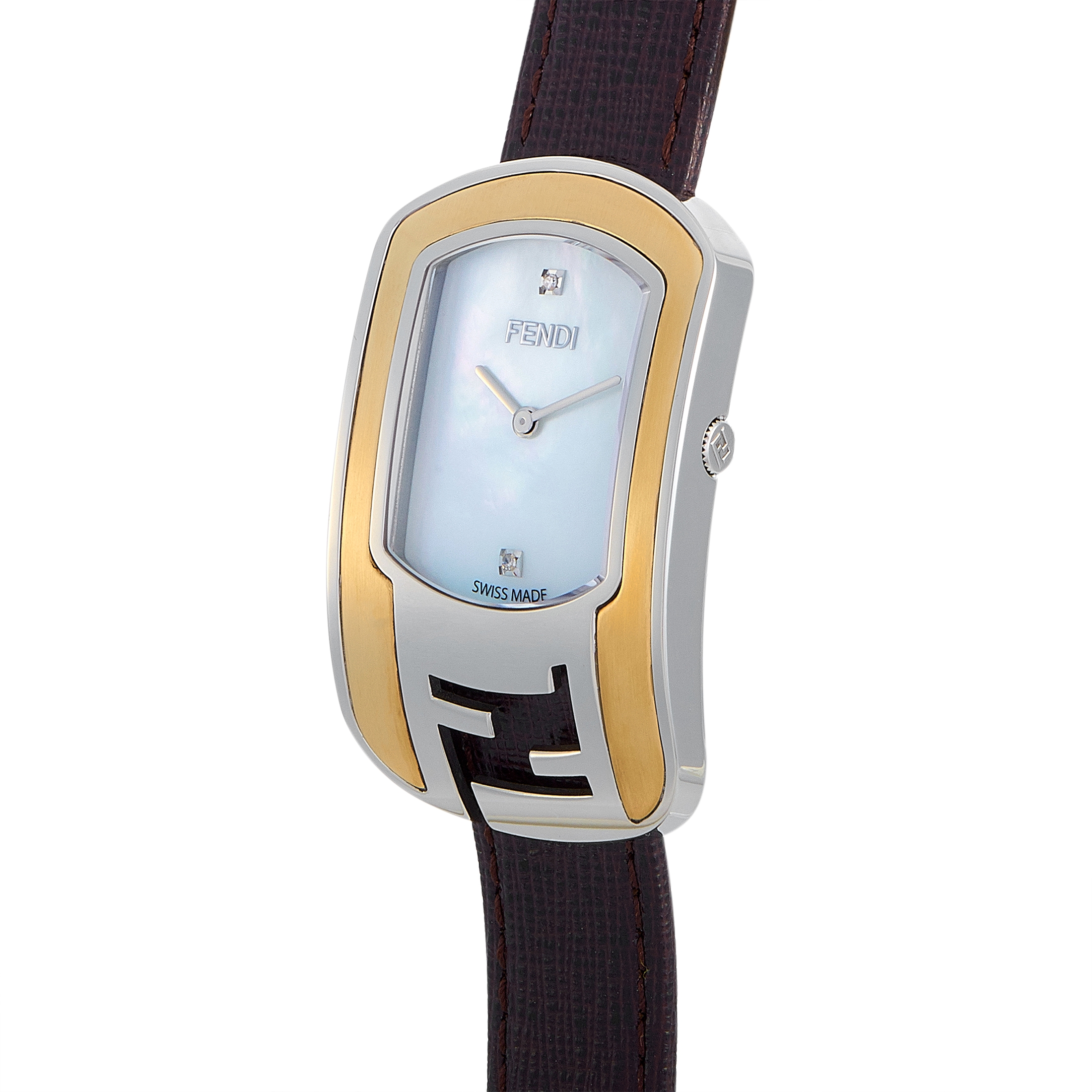 The Fendi Chameleon watch, reference number F303134521D1, boasts a stainless steel case presented on a brown leather strap that is fitted with a tang buckle. This model is powered by a quartz movement and indicates hours and minutes on the mother of pearl dial accentuated with diamonds. The watch is water-resistant to 30 meters.