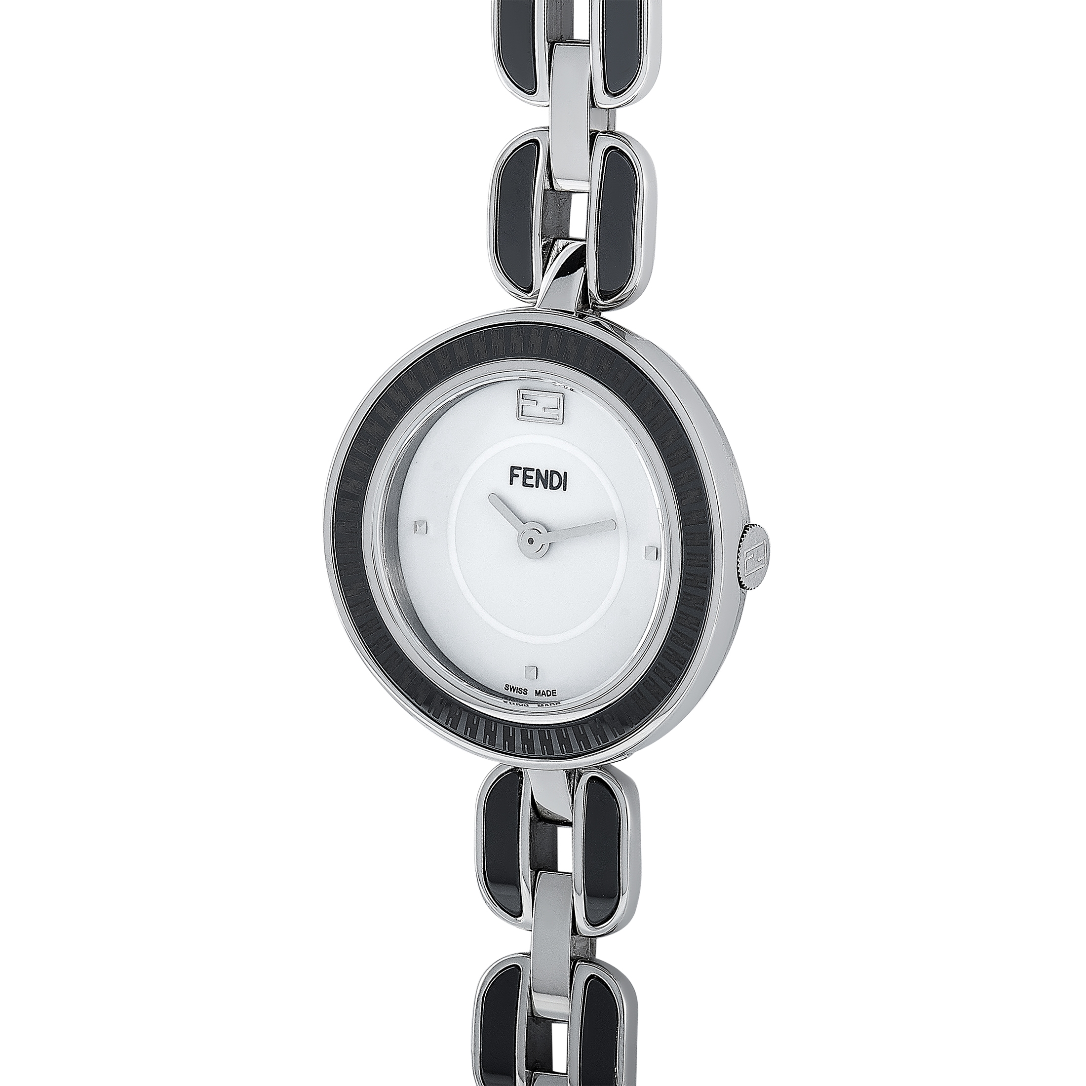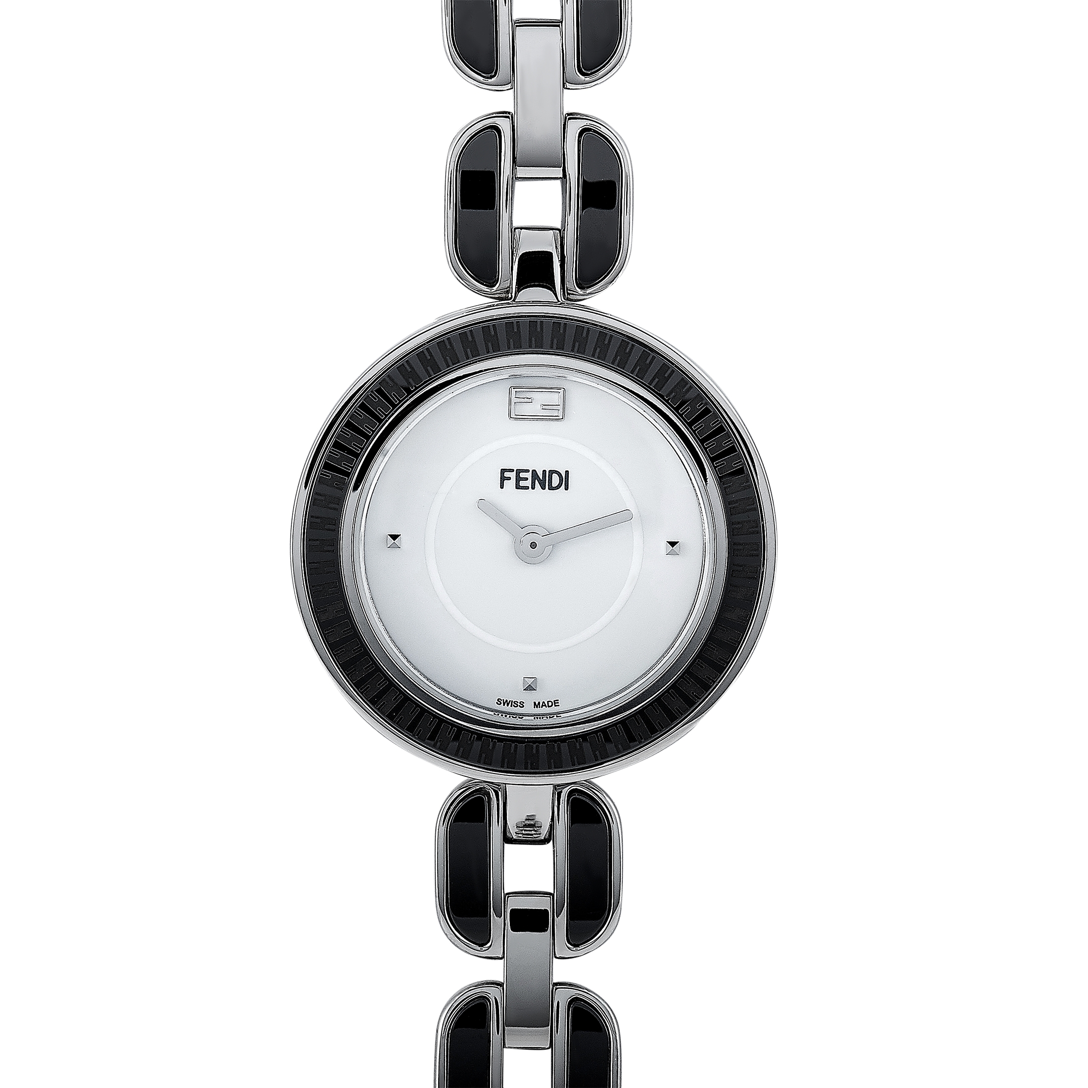 The Fendi My Way watch, reference number F353024001, comes with a 28 mm stainless steel case that boasts a bezel with a black ceramic inlay. The case is presented on a stainless steel bracelet with black ceramic inserts. This model is powered by a quartz movement and indicates hours and minutes on the white dial. The watch is water-resistant to 50 meters.