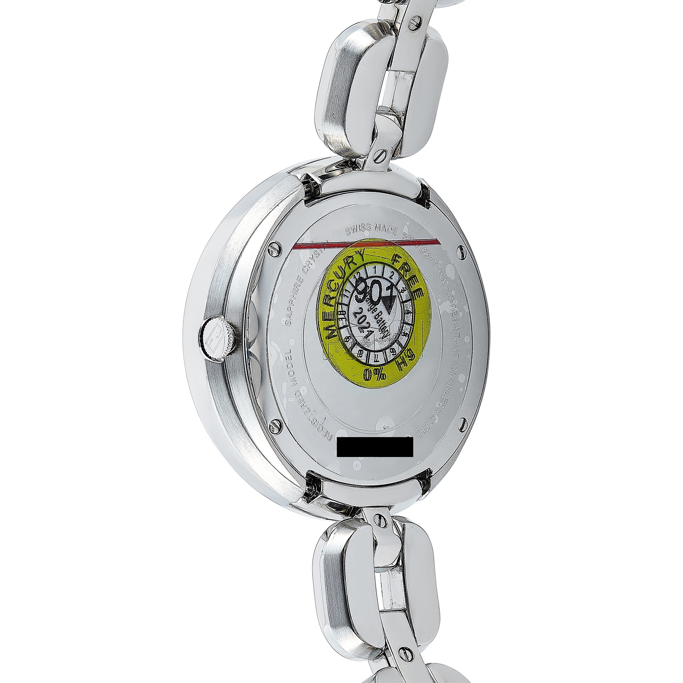 The Fendi My Way watch, reference number F357034003, comes with a 36 mm stainless steel case that boasts a bezel with a blue ceramic inlay. The case is presented on a stainless steel bracelet with blue ceramic inserts. This model is powered by a quartz movement and indicates hours and minutes on the white dial. The watch is water-resistant to 50 meters.