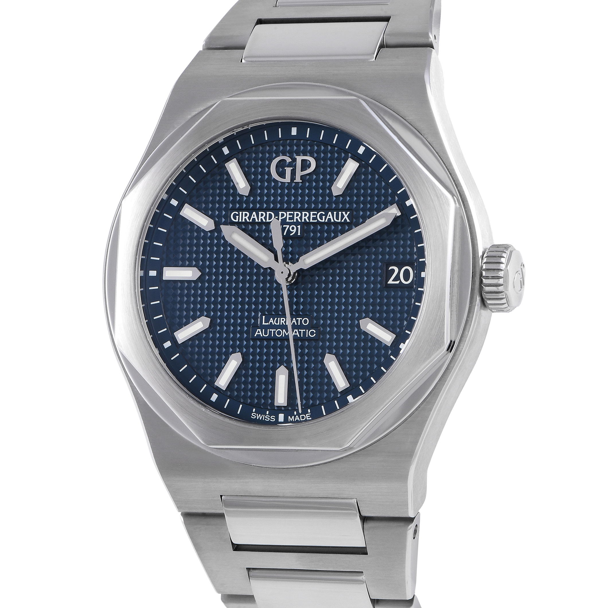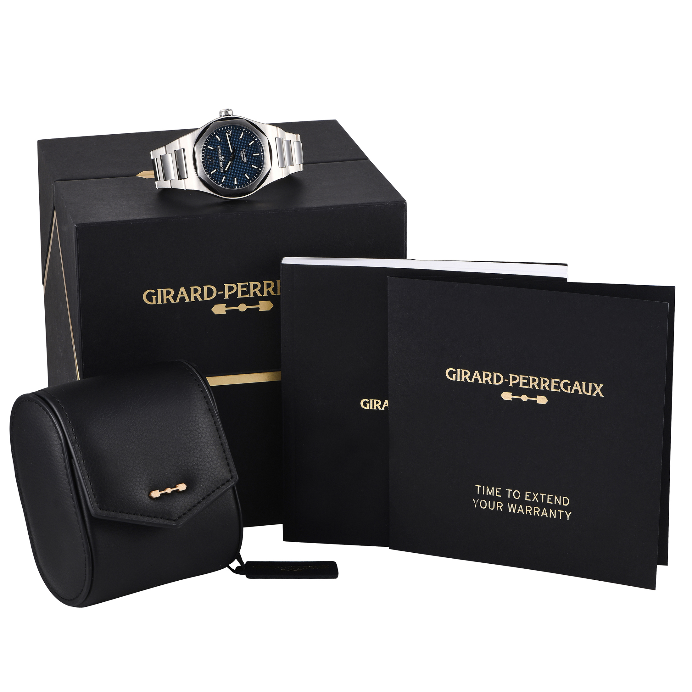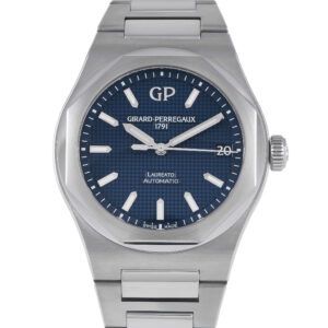 This pre-owned Girard Perregaux Laureato 42mm Blue Dial Men’s Watch 81010-11-431-11A comes with papers, a leather watch case, and the manufacturer’s box.