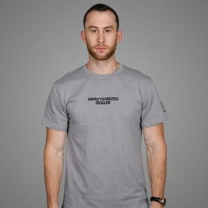The Limited Release Unauthorized Dealer® gray colored crewneck T-shirt features an UNAUTHORIZED DEALER® rubberized graphic on the front, a rubberized LB icon on the left sleeve cuff, and a rubberized WAITLIST graphic on the back.