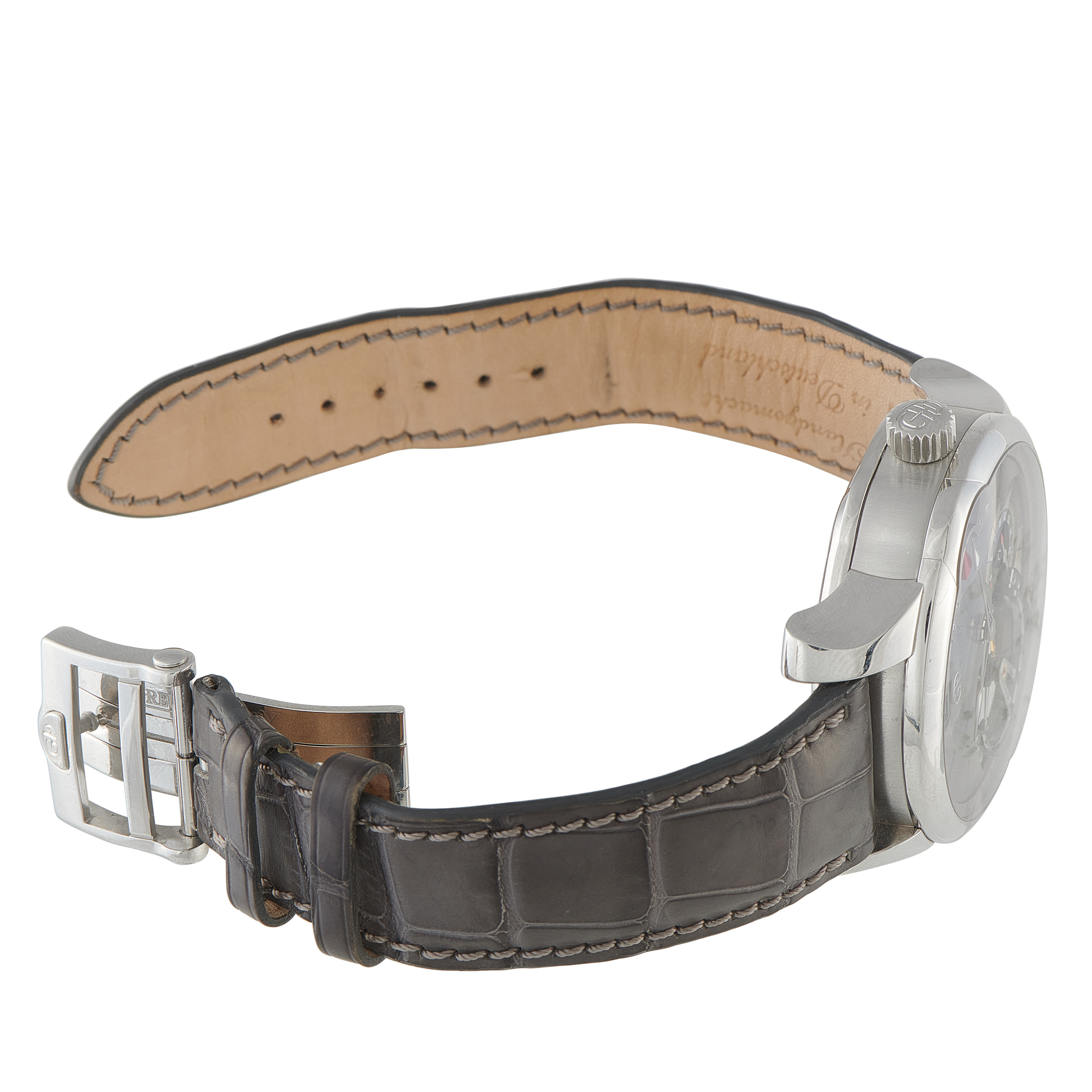 A rare platinum edition limited to just 8 pieces. This Double Tourbillon 30° Asymétrique positions the double tourbillon off-center, introducing an asymmetrical dial that brings focus to the brand’s 30-degree inclined escapement. Two fast-rotating barrels supply energy for 72 hours. The display on the anthracite dial includes a small seconds subdial and a power reserve indicator. Securing the 43.5mm case to the wrist is a dark gray leather strap with a matching folding clasp.