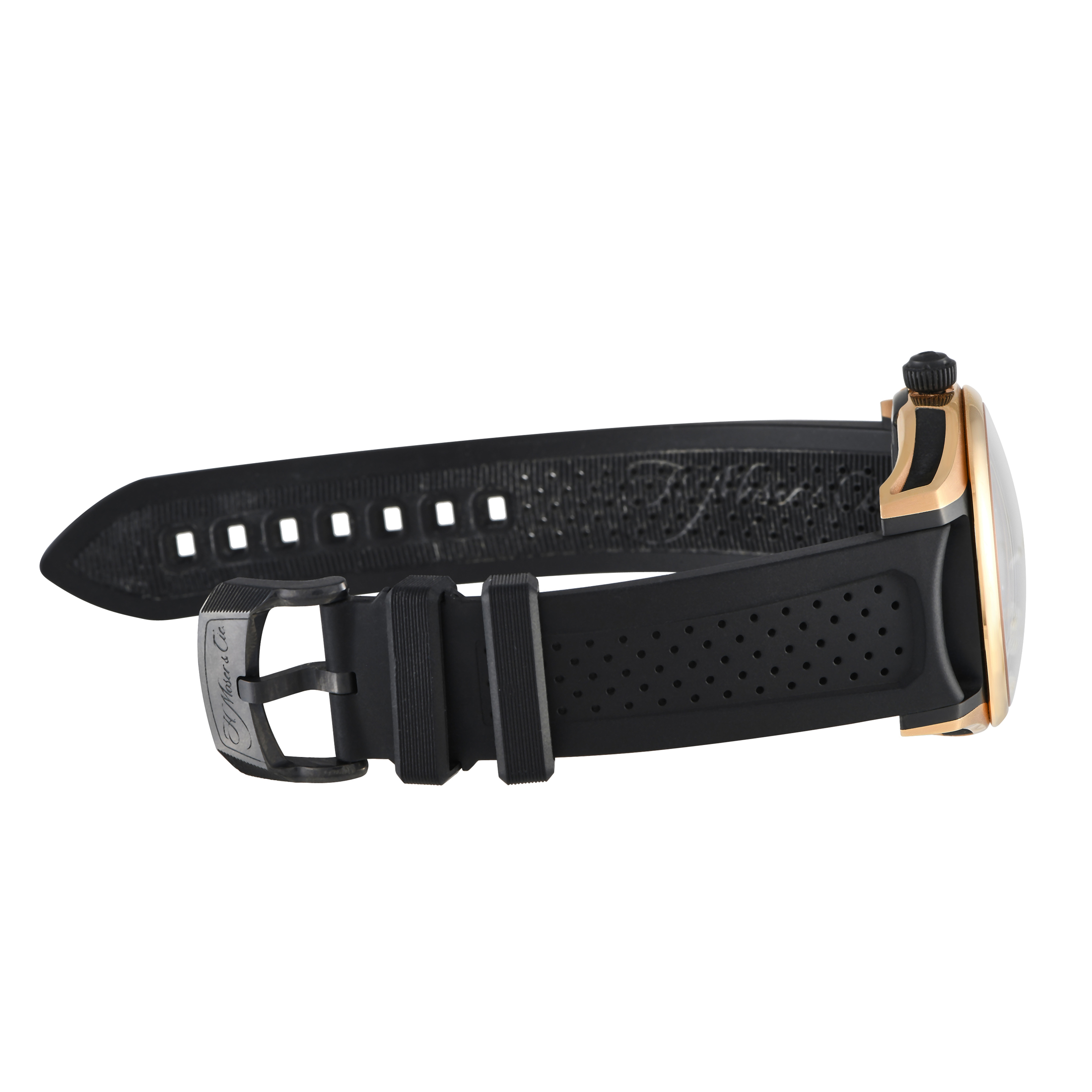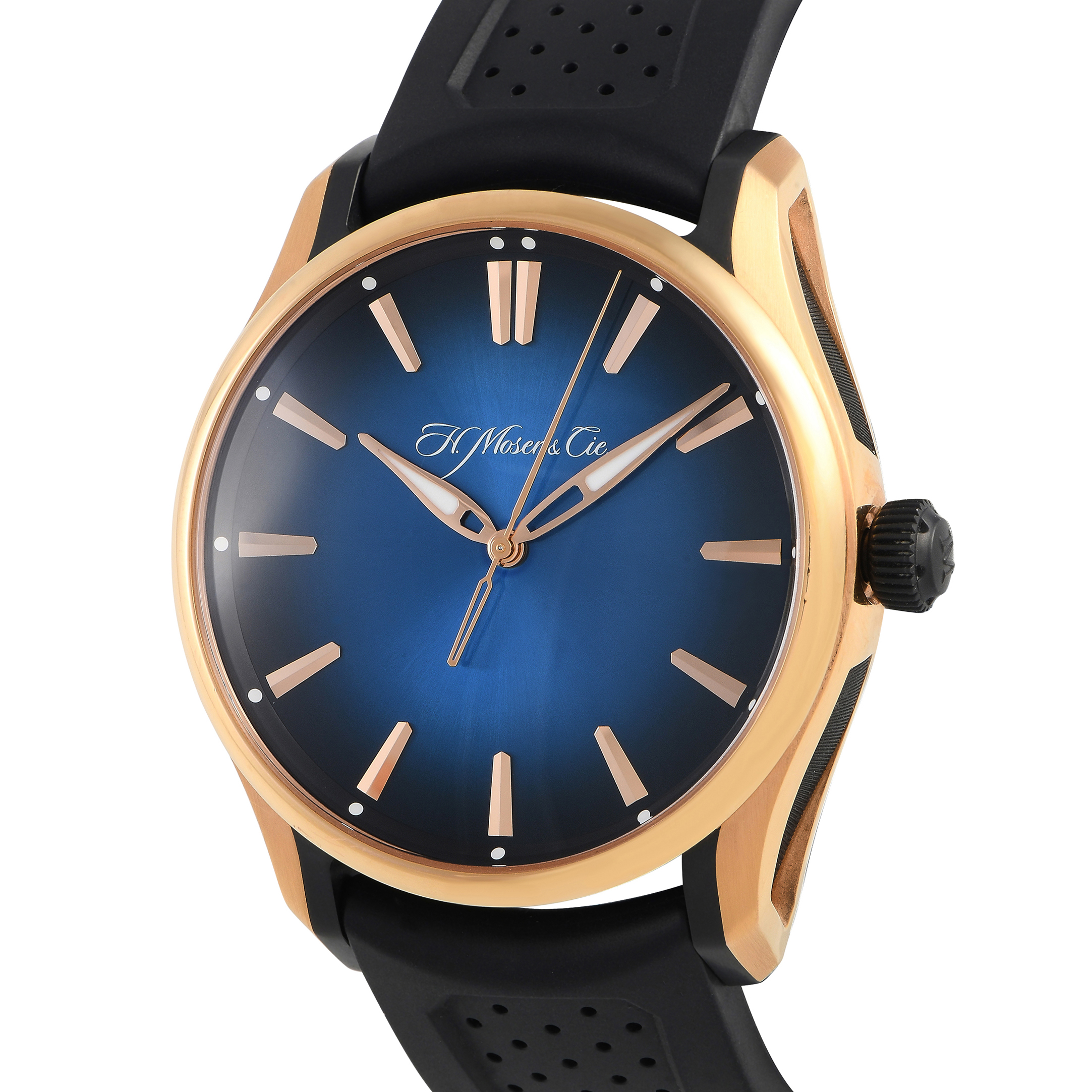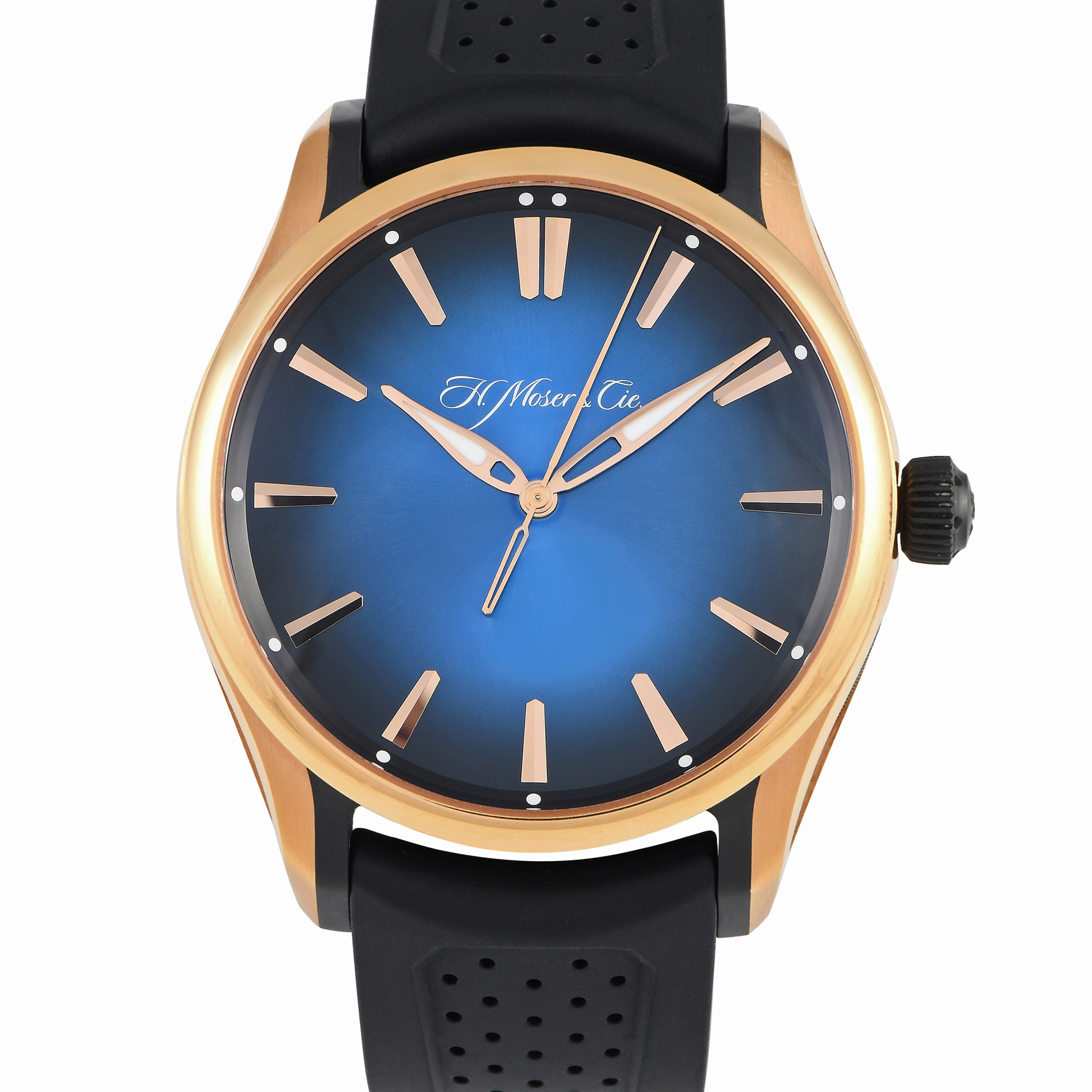 The H. Moser & Cie Pioneer Center Seconds ref. 3200-0903 is a strikingly minimalistic yet elaborately finished watch. Its 42.8mm-wide case is crafted in rose gold and titanium, and fitted onto a rubber strap with perforated detail. The time-only dial is simple and showy at once, with its midnight blue fumé, applied angular rose gold hour markers, slim seconds hand, and luminescent hour and minute hands. The HMC 200 movement beats inside the watch, offering a 3-day power reserve.