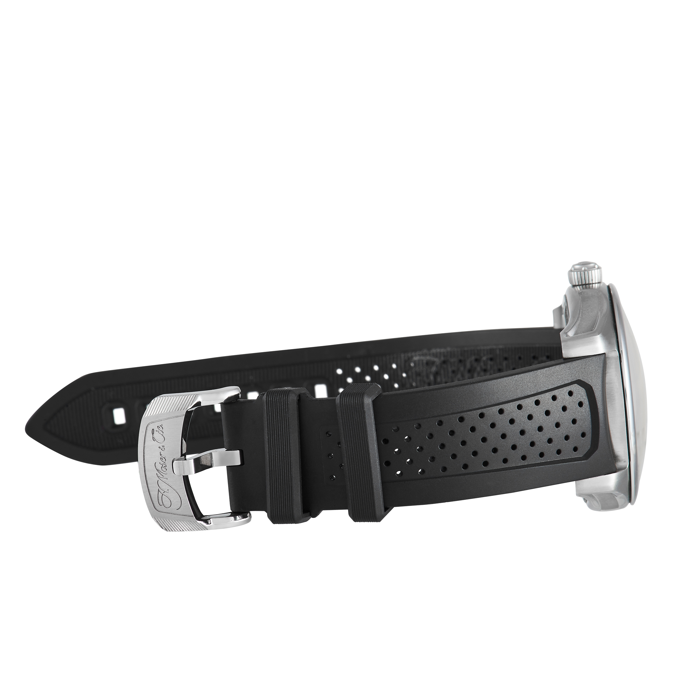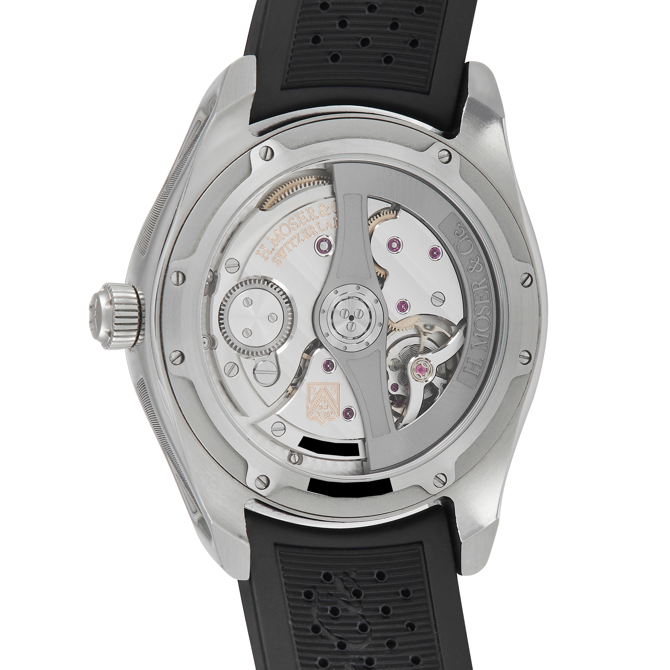 Launched in 2020 is this attention-grabbing H. Moser & Cie men’s watch with a vivid red dial. It is fitted with a rubber strap and a 42.8mm stainless steel Pioneer case with a flat-convex bezel and vertically brushed lugs. The face of this watch features an attractive red fumé dial with a lighter red at the center that darkens toward the dial’s edge. As a time-only watch, the layout is simple with three hands, indexes, the Moser signature, and an inner bezel with white dot markers. Through the sapphire display case back, you can admire the 3Hz self-winding caliber HMC 200 that powers this watch.