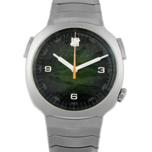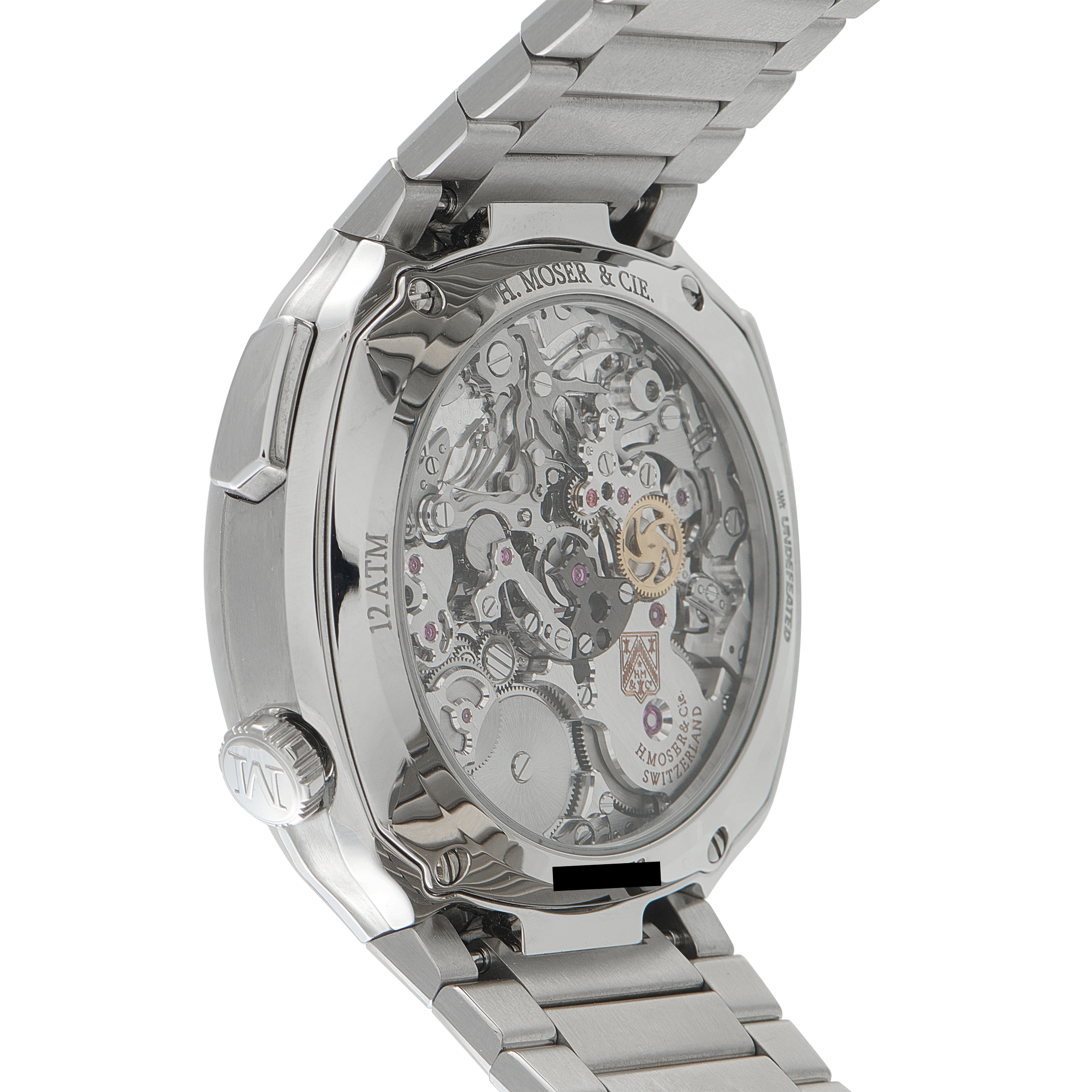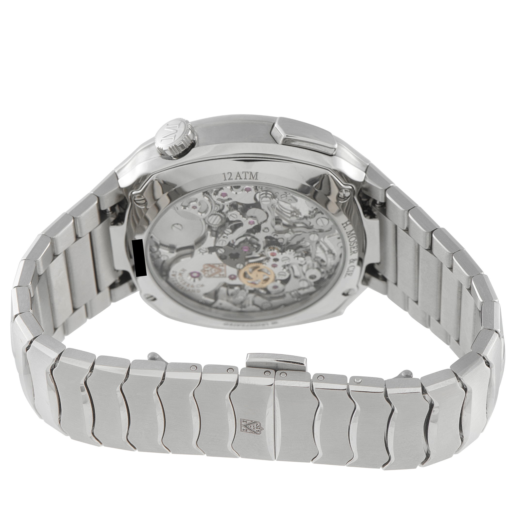 The reverse side delivers equal presence. Through the transparent caseback, the automatic Caliber HMC 902 is fully visible, revealing its open architecture and centrally mounted chronograph mechanism. This rare and exclusive chronograph watch is presented with a 42.3mm steel case on a matching steel bracelet, with a screw-down crown positioned at 4 o’clock.