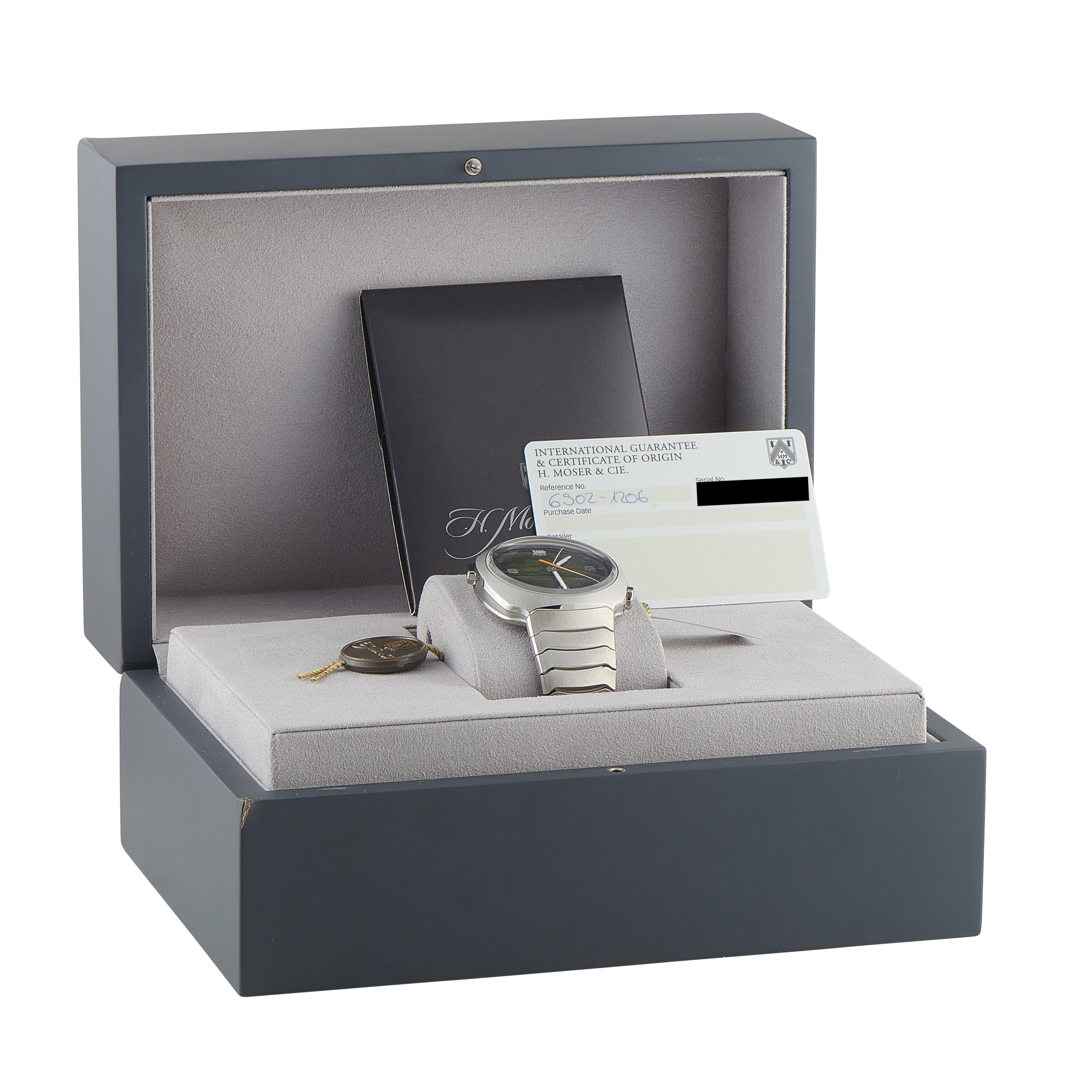 The manufacturer’s box and papers accompany this H. Moser & Cie Streamliner Undefeated Green Camo Dial Chronograph Watch 6902-1205.