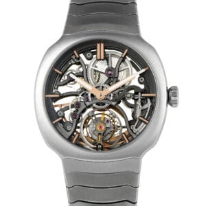 Simplicity meets complexity in this H. Moser & Cie creation. The Streamliner Tourbillon Skeleton ref.6814-1200 features a lugless, cushion-shaped steel case with an integrated steel bracelet that molds naturally to the wrist. H. Moser & Cie adopted the “less is more” design approach on the outside, allowing the focus to shift to the mechanical beauty inside. A slightly domed sapphire crystal provides a full view of the openworked dial, featuring a skeletonized bridge, red gold-plated baton index markers and hands, and a flying tourbillon. The self-winding caliber HMC 814, which powers the watch, is also in a full skeletonized form, visible through the transparent caseback. This 167-part movement has 28 jewels and a 72-hour power reserve.