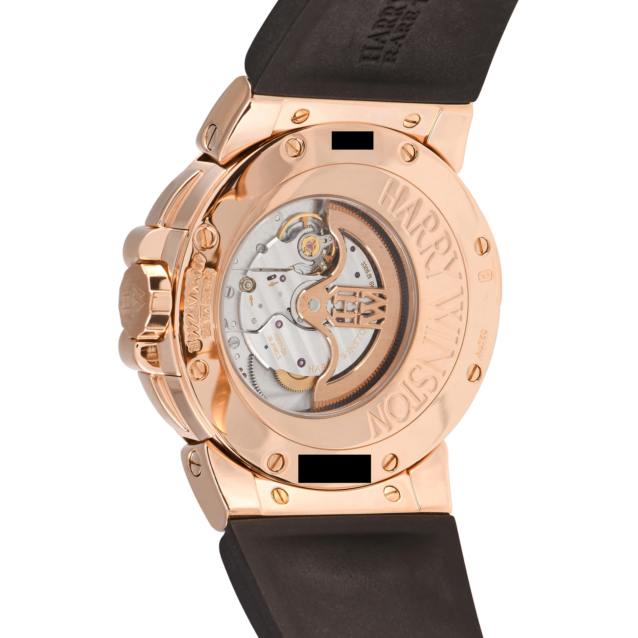 This pre-owned Harry Winston Ocean Dual Time Watch 400-MATZ44R is accompanied by papers, additional leather straps, and the manufacturer’s box.