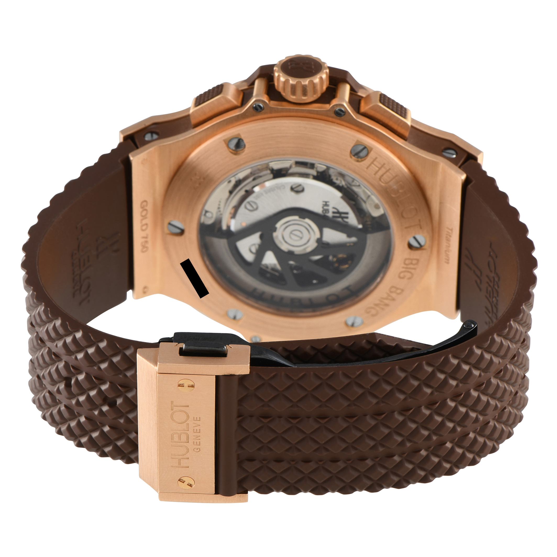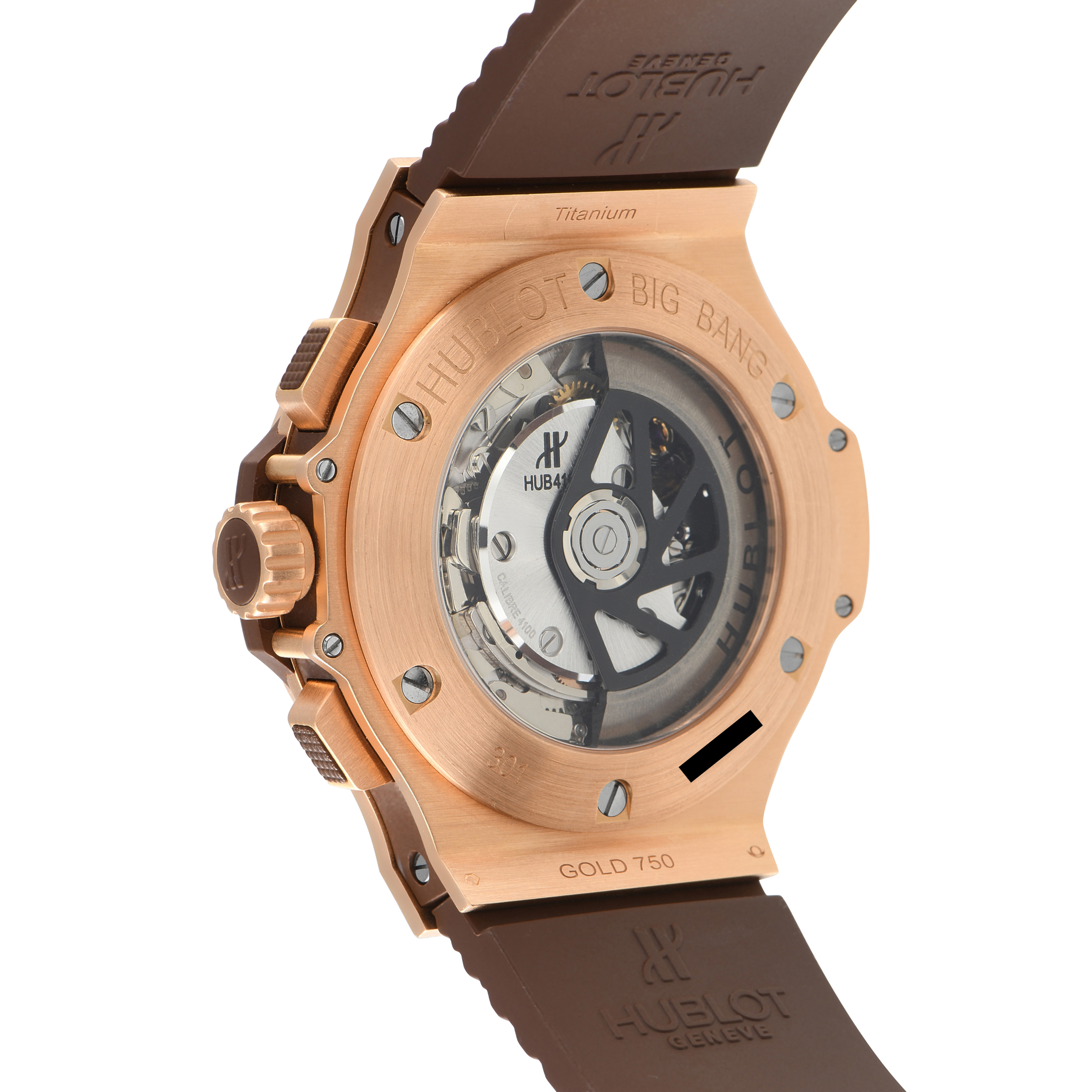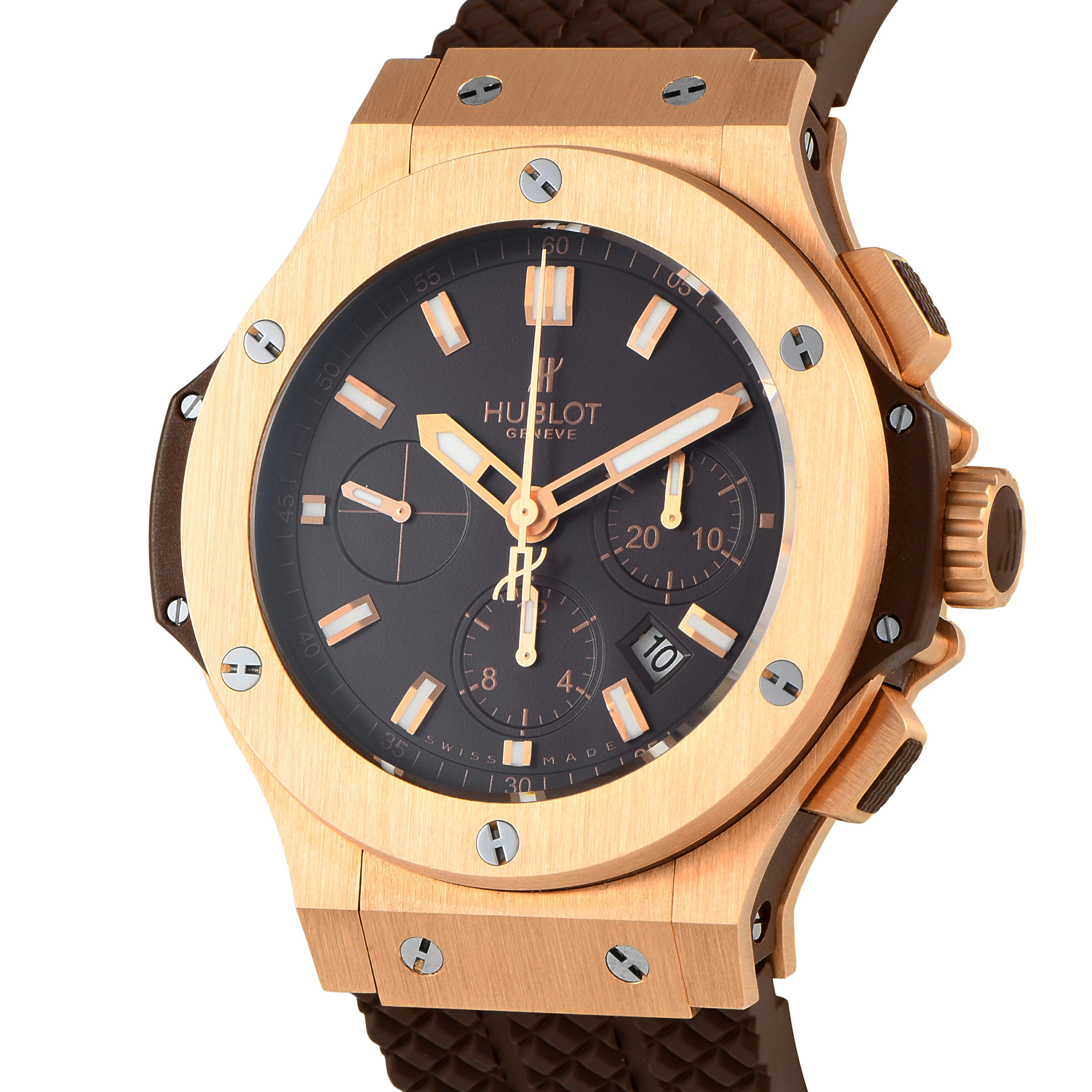 The Big Bang Chronograph ref. 301.PC.3180.RC is a robust sports watch made in luxurious rose gold by Hublot, a Swiss luxury watchmaker who has mastered the art of fusion. Its 18K rose gold case measures 44mm wide and is topped with a matching rose gold bezel. Chocolate brown composite resin lateral inserts and a chocolate brown dial add a layer of richness to the watch. At its heart is the self-winding HUB 4100 movement, with time, date and chronograph functions, and a 42-hour power reserve.