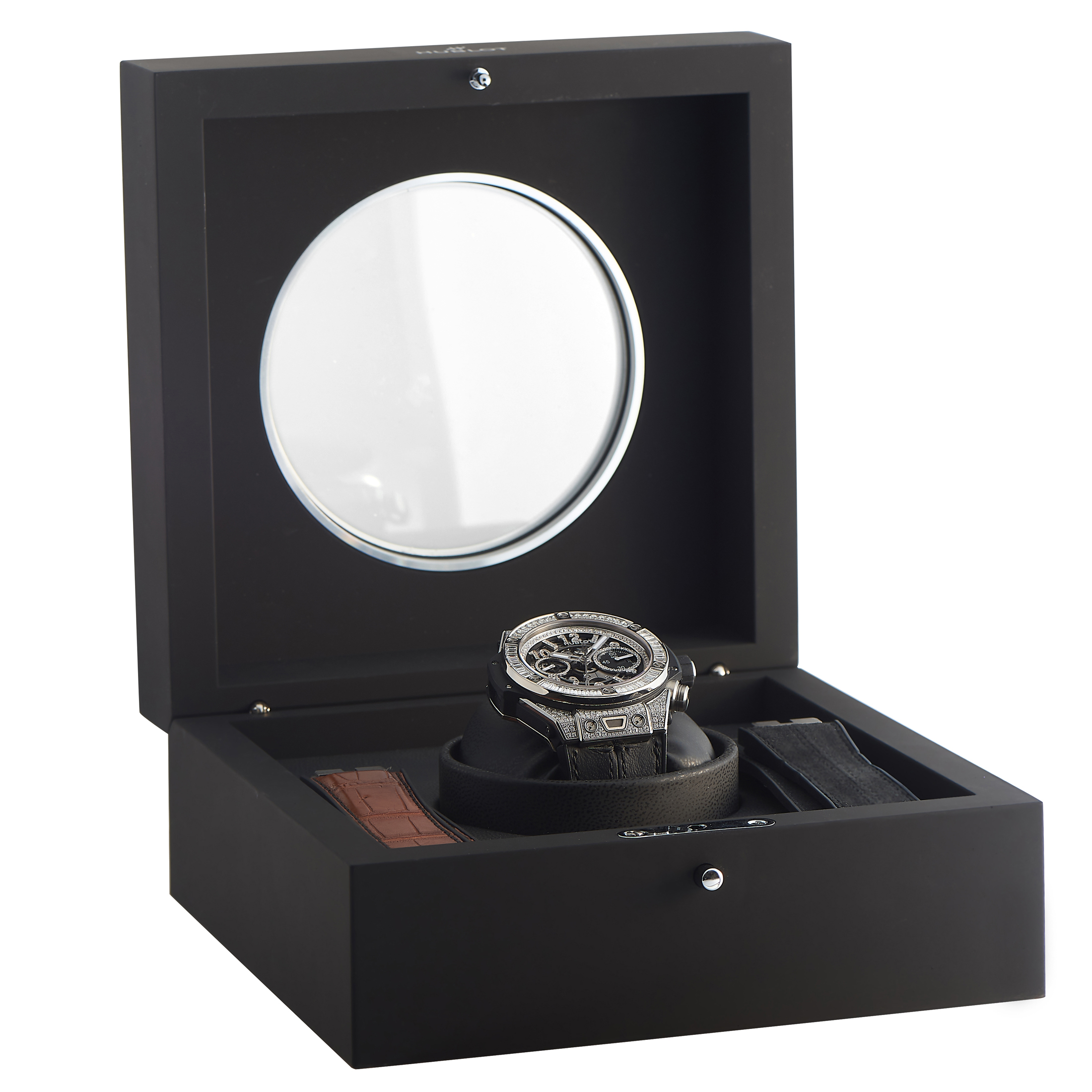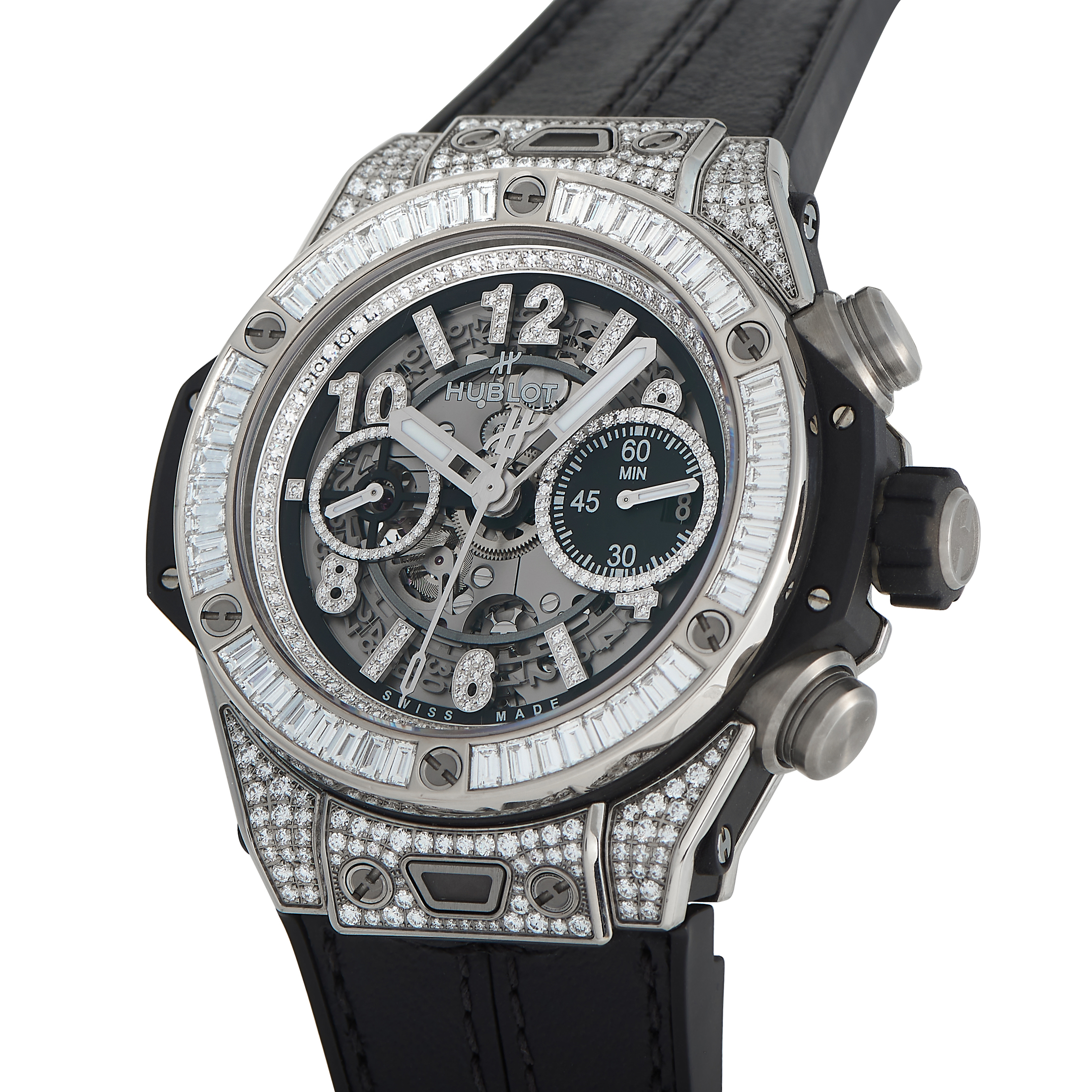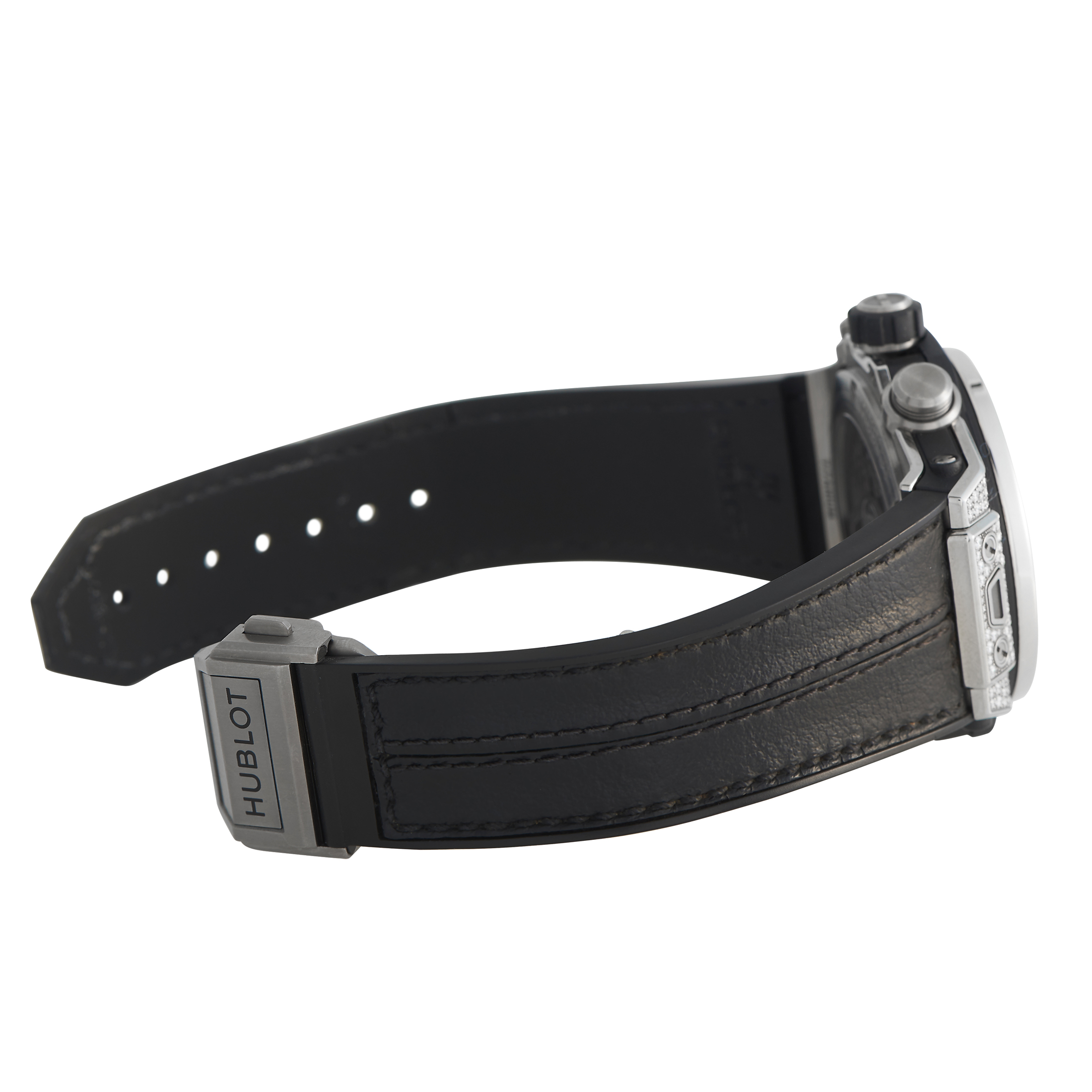 Bold and breathtaking in design, this impressive timepiece makes a statement thanks to the 44mm Titanium dial, diamond-encrusted bezel, and sophisticated black leather strap. The grey skeleton dial features unforgettable details like luminous silver-toned hands, diamond-accented hour markers, and diamond-accented chronograph subdials. This timepiece is powered by an automatic calibre HUB 1280 movement with 72 hours of reserve time.