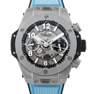 This is a pre-owned Hublot Big Bang Unico Titanium Watch 441.NX.1171.RX. It is accompanied by a secondary strap and the manufacturer’s box.