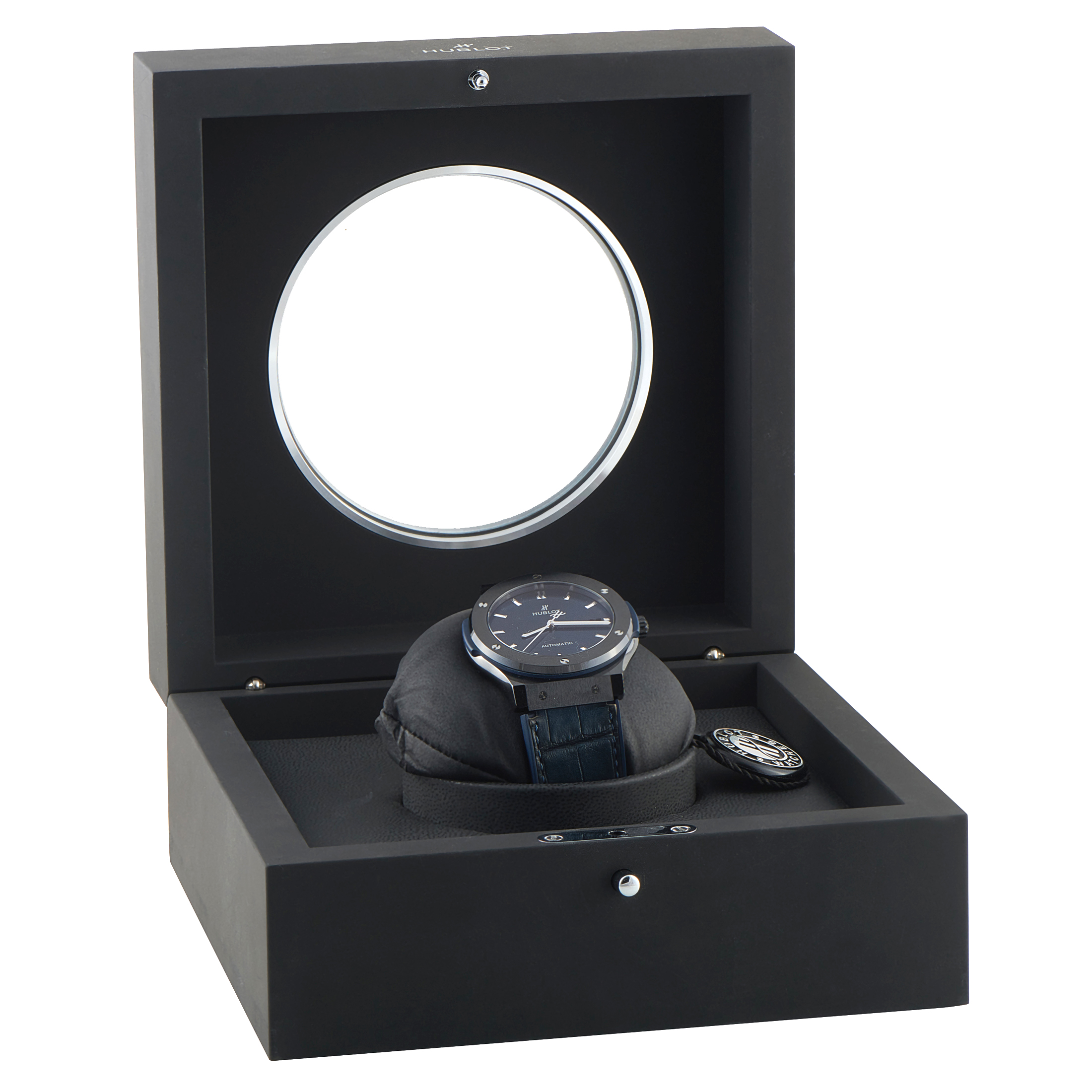 Offered pre-owned, this Hublot Classic Fusion Blue Dial Ceramic Watch 511.CM.7170.LR comes with the manufacturer’s box.