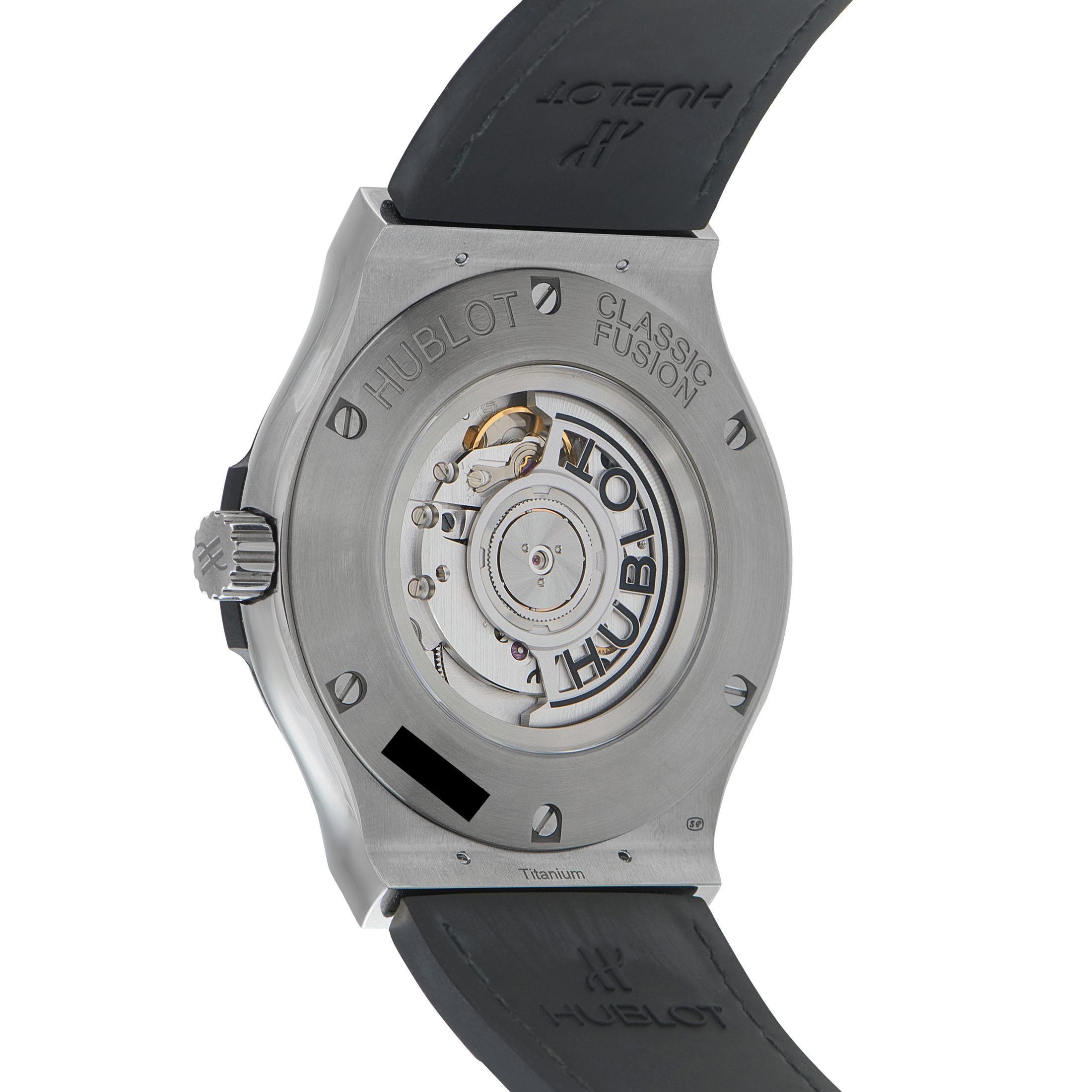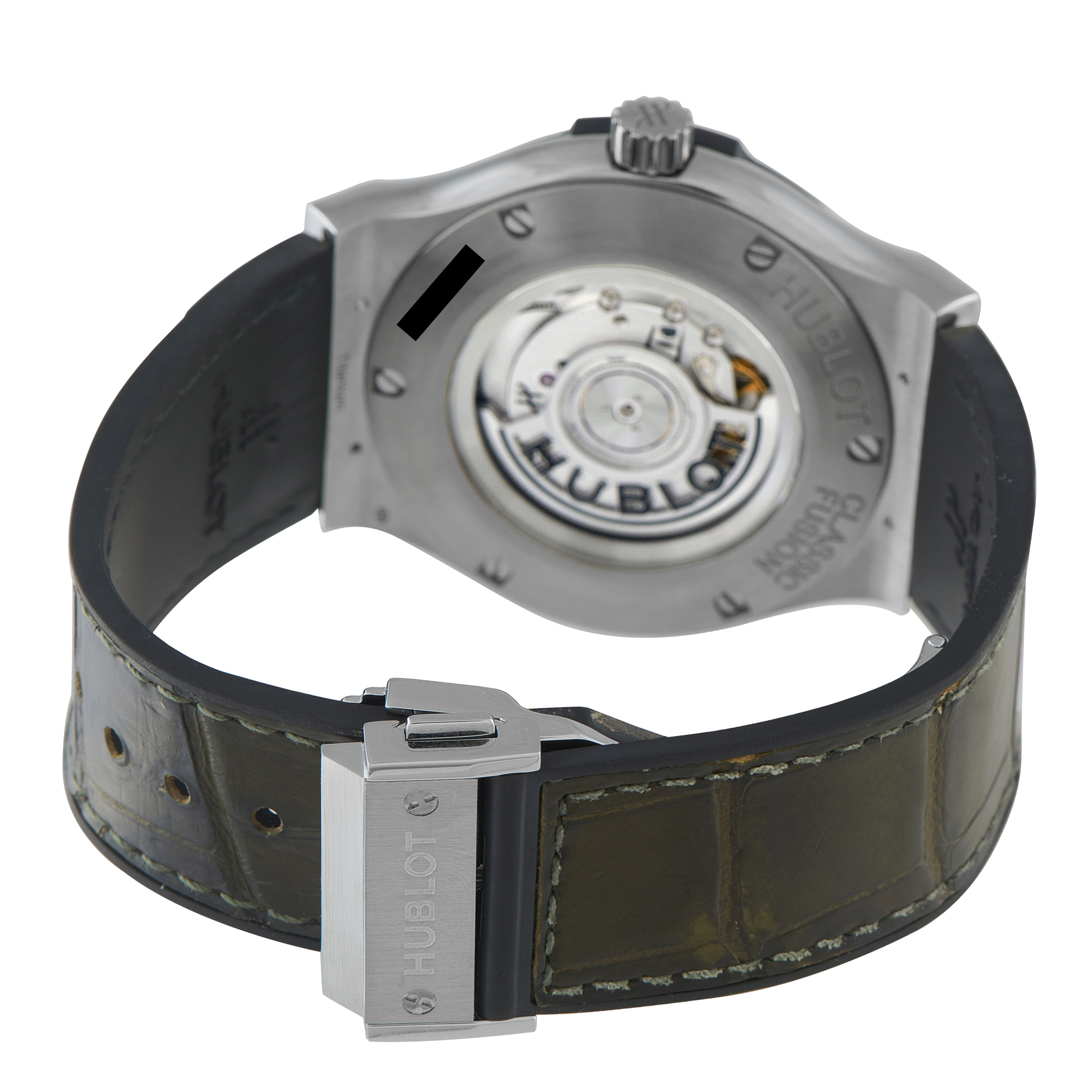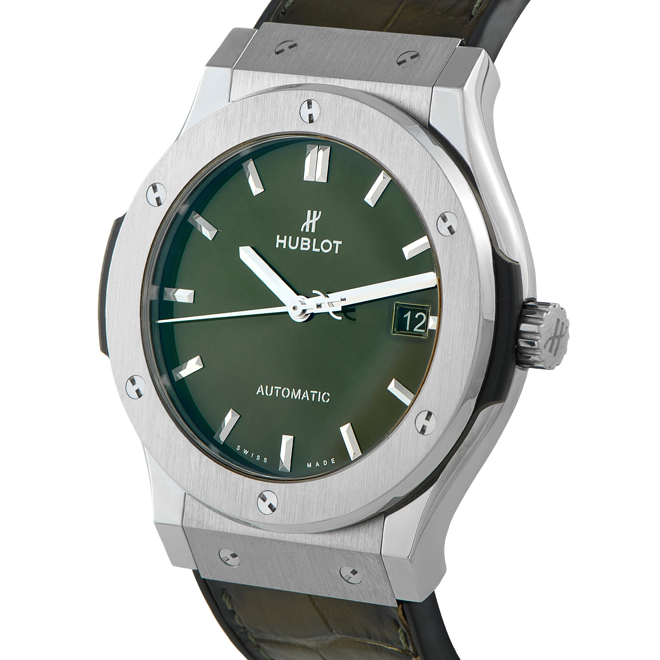 This pre-owned Hublot Classic Fusion Green Dial Titanium Watch 511.NX.8970.LR comes with the manufacturer’s box.