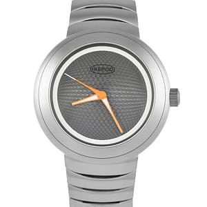 Light, comfortable, and striking on the wrist, the Ikepod Horopod Puxi is an excellent option for a unique timepiece. It has a 44mm titanium case with a rounded, pebble-like shape, worn on a matching titanium bracelet. The dial is inspired by optical art, finished in gray tone, and detailed with perforated dots, a luminous ring, and contrasting orange hands. This futuristic wrist companion is driven by the 4Hz ETA 2824 automatic winding movement with 38 hours of power reserve.