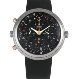 Only 25 pieces of the black-dialed Skypod ref. Eero SK01-RP-LB were made. This avant-garde watch features a unique pebble-shaped case in titanium, measuring 46mm in diameter. It has a domed sapphire crystal on top and a porthole sapphire crystal at the back. Its black dial has a circular brushed finish, detailed with white and orange markings. The GMT and small seconds hands are in white, the chronograph hands are in orange, and the central hour and minute hands are in steel. The small seconds counter is at 3, chrono minutes at 6, GMT 24-hour display at 9, and 12-hour counter at 12. Its beating heart is the LJP 8103 automatic-winding movement with 40 hours of power reserve.