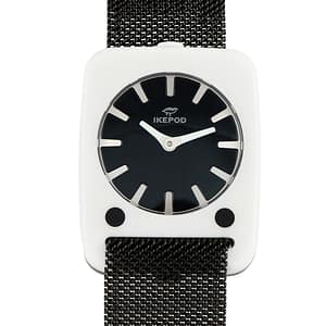 This is an unworn Ikepod Solaris Black and White Ceramic Watch SCB12. It comes with papers and the manufacturer’s box.