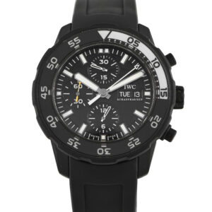 In 2009, IWC released the stealthy Aquatimer Chronograph “Galapagos Islands” edition ref. IW376705 as a tribute to the Charles Darwin Foundation. This is a 44mm timepiece with a steel case vulcanized in black rubber, fitted with matching black rubber-coated bezel, crown, and chronograph push-pieces. The bezel insert with a black and white 60-minute dive scale is protected by a sapphire crystal and has blue and green Super-LumiNova. The flat, black dial also has Super-LumiNova-filled index hour markers and broad hands. A recessed sub-dial for 30-minute chronograph totalizer is at 12, and the 12-hour chronograph sub-dial is at 6. At 9 o’clock is a small seconds register with a yellow hand. The day and date displays sit side by side at 3 o’clock. This watch is driven by caliber 79320 automatic movement with 44 hours of power reserve.