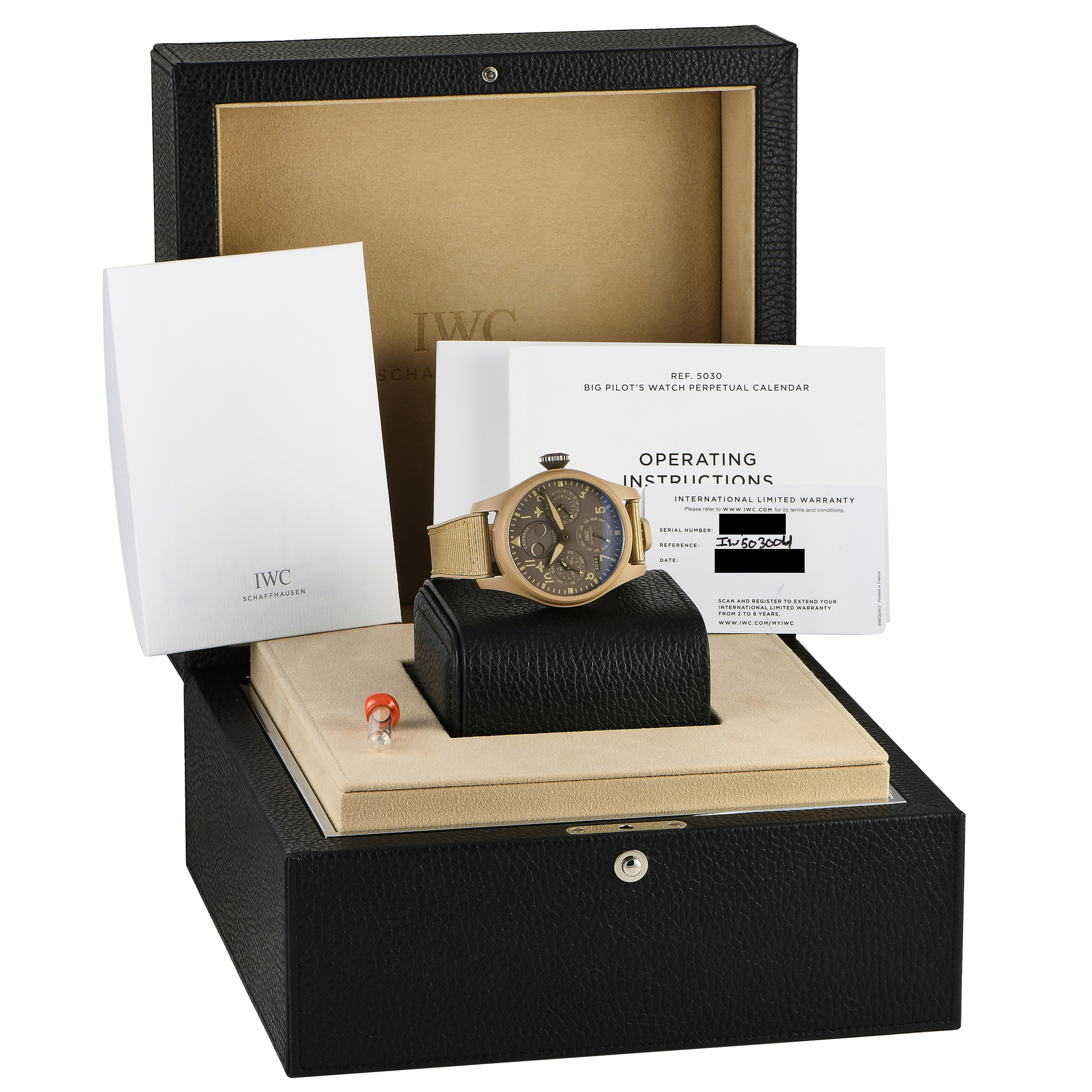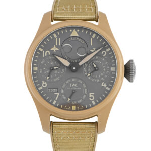 This pre-owned IWC Big Pilot’s Perpetual Calendar Top Gun “Mojave Desert” Watch IW503004 comes with papers and the manufacturer’s box.