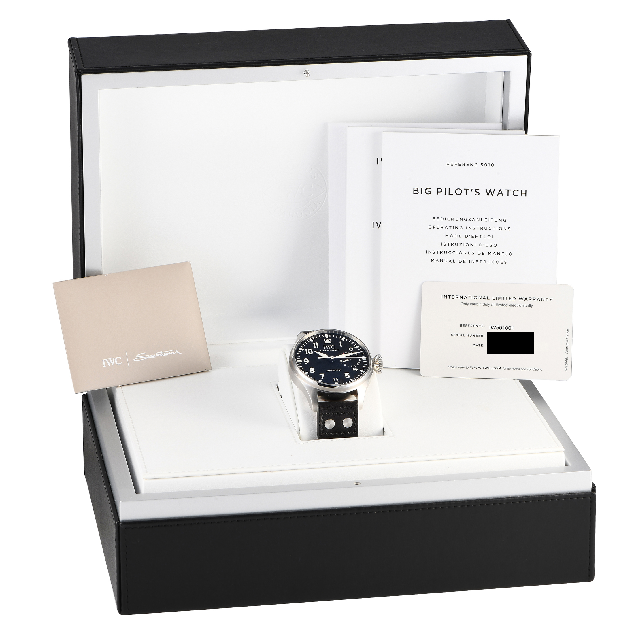 This pre-owned IWC Big Pilot’s Watch IW501001 comes with papers and the manufacturer’s box.
