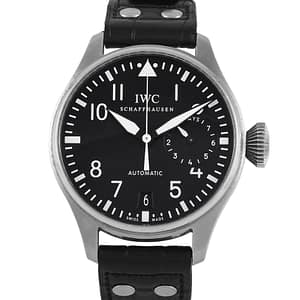 Big and bold yet with a minimalist soul, this IWC Classic Big Pilot features a massive 46mm stainless steel case paired with a large onion-shaped crown and a conservatively laid-out black dial. This extra-large but very wearable dress watch comes with instantly legible painted Arabic numeral hour markers with luminous hands and index hour markers. A power reserve indicator is located at the 3 o’clock position while the date window is at 6 o’clock. Powering this watch is IWC Caliber 51110 automatic movement with 44 jewels and a 7-day power reserve. Completing the understated and monochromatic profile of the watch is a black leather strap with a stainless steel deployant clasp.