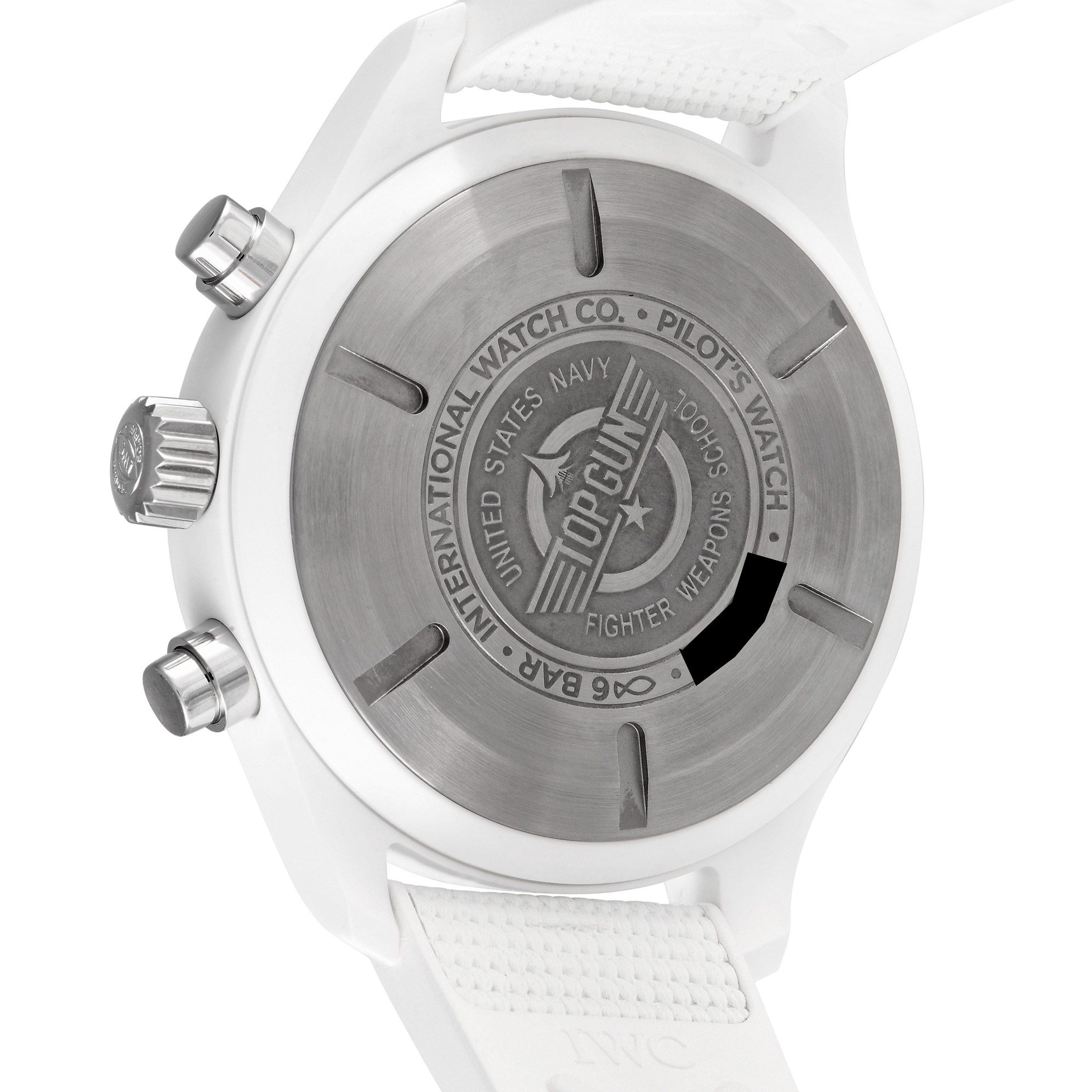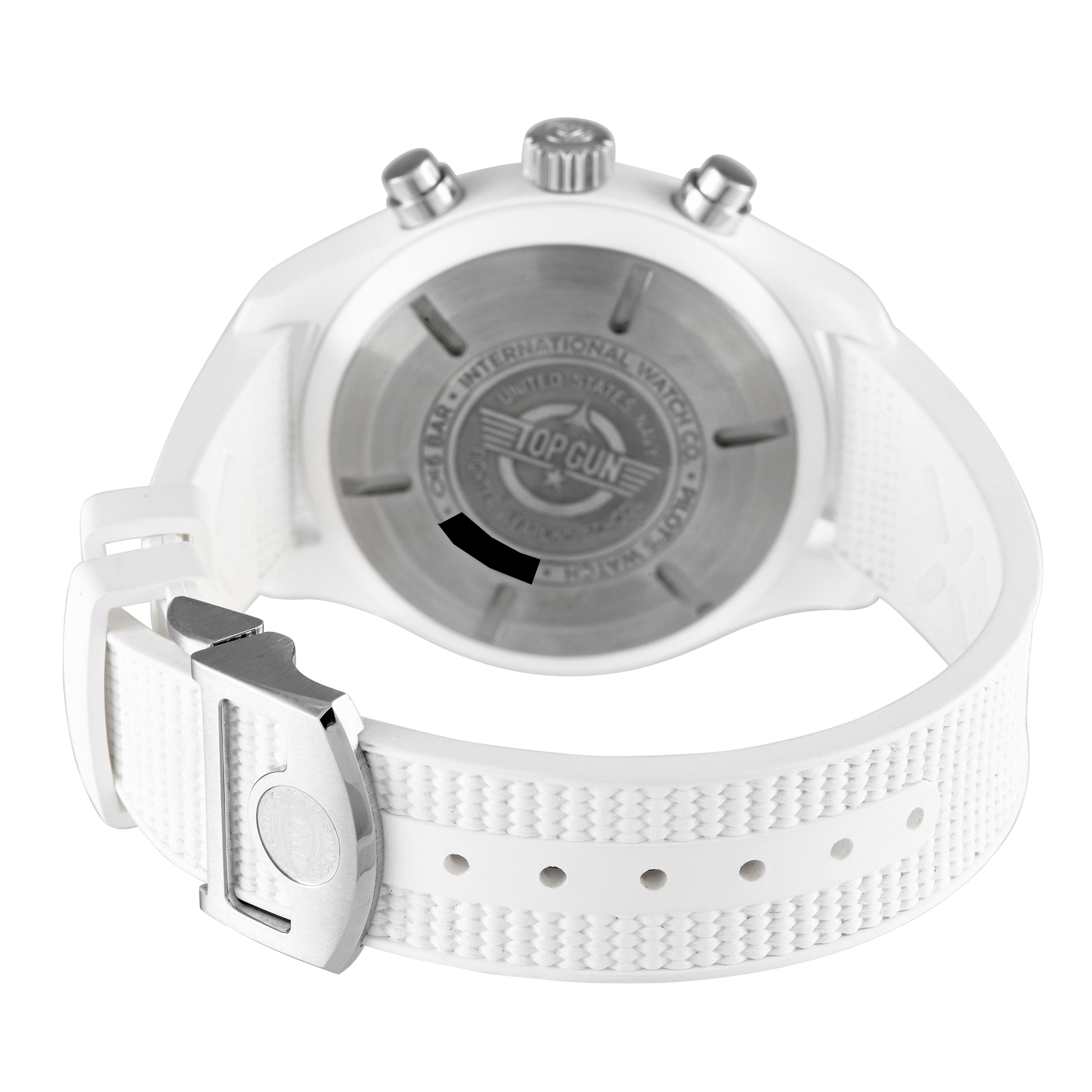 Masculine and conservative at the same time, this TOP GUN Edition “Lake Tahoe” Pilot’s Watch impresses with its legibility and boldly monochromatic style. The ceramic case has an attractive satin white finish and is paired with a white rubber strap with a textile-textured inlay. The crown, chronograph pushers, and the strap’s deployant buckle are in steel. The “Flieger-style” dial is black with luminescent hands and 12, 3, 6, and 9 o’clock markers. Inside the watch is caliber 69380 automatic movement operating at 4Hz with a 46-hour power reserve. The metal caseback of the watch is engraved with the Top Gun United States Navy Fighter Weapons school logo.