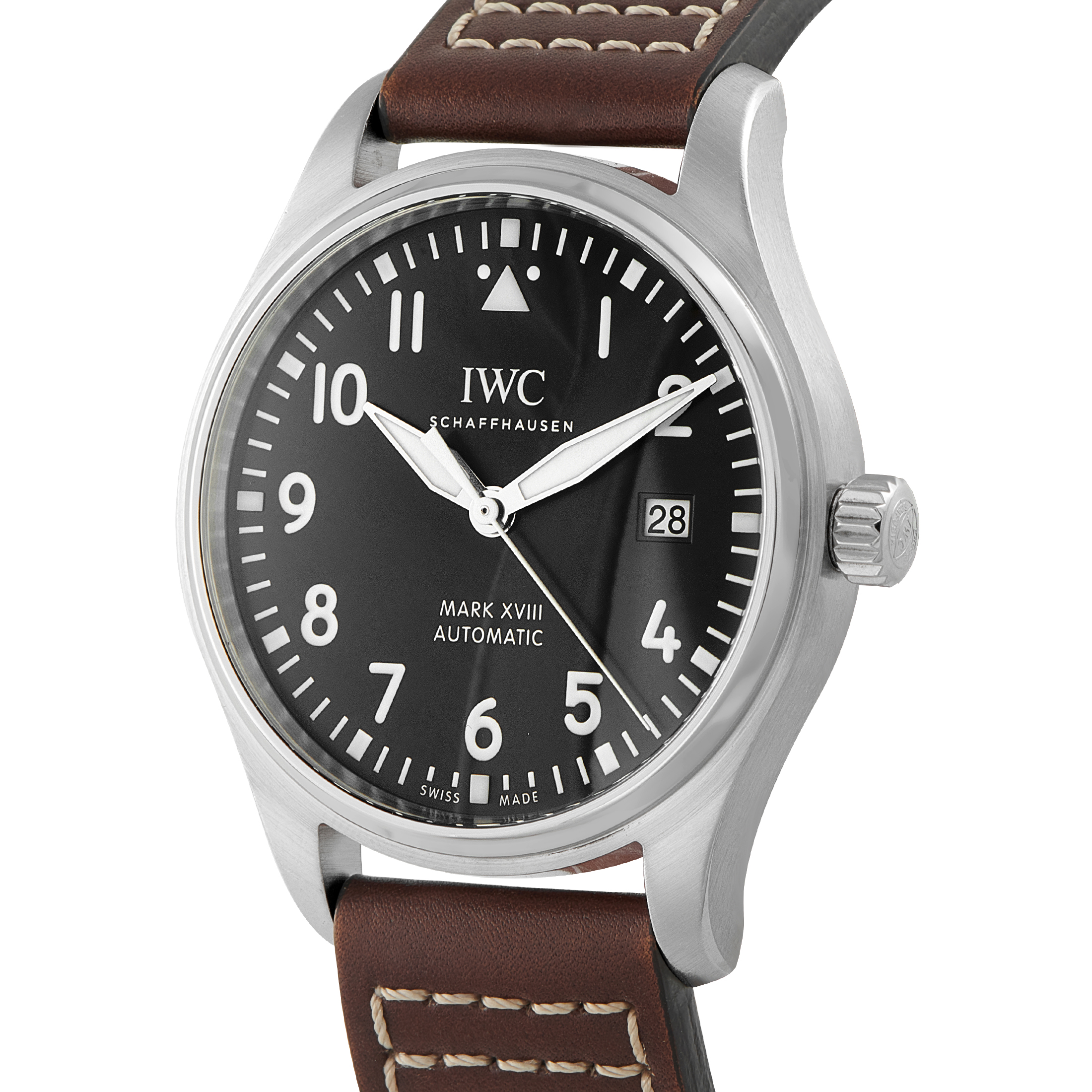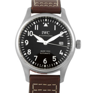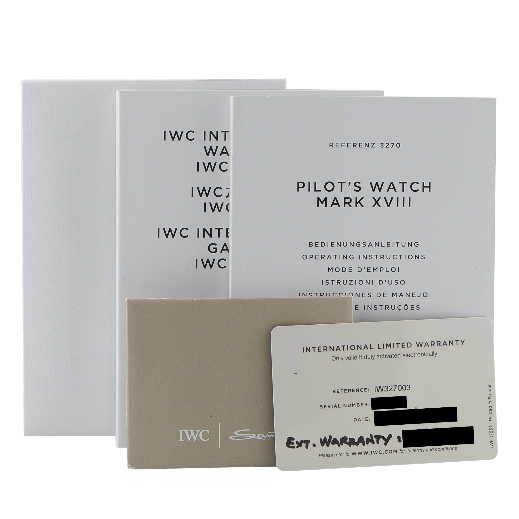 Papers and a gift box accompany this pre-owned IWC Pilot’s Mark XVIII Edition “Antoine de Saint Exupéry” Steel Watch IW327003.